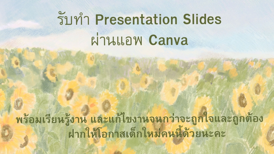 เคยมีประสบการณ์การทำสไลด์ไปพรีเซ็นต์แข่งระหว่างคณะเกษตรกับวิทยาศาสตร์ และระหว่างเรียนมีการทำสไลด์งานแต่ละงานอยู่บ่อยๆค่ะ ไม่ได้เก่งและมีประสบการณ์การรับจ้างทำสไลด์ แต่อยากเปิดโอกาสให้ตัวเองได้ลองทำและเรียนรู้ในสิ่งใหม่ๆ พร้อมเรียนรู้และแก้ไขจนกว่าจะพอใจค่ะ คุยงาน บรีฟงานกันก่อนตกลงรับงานและจ่ายตัง ตกลงรับงานแล้ว ตกลงราคา และโอนตัง เริ่มทำงานและคอยส่งงานให้ตรวจ แก้ไขงานตามจุดที่ต้องการและแก้ไขจนกว่าจะถูกต้อง แก้ครบ ส่งงาน ปิดงาน