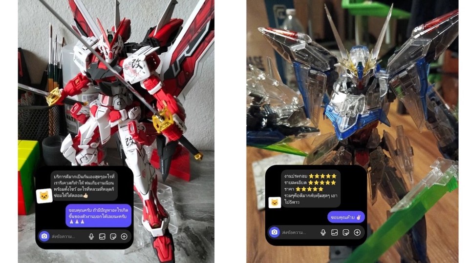 We offer services for Gunpla & model assembly, cleaning, and painting." (เราให้บริการประกอบ ทำความสะอาด และทำสีกันพลาและโมเดลต่างๆ) รับประกอบกันพลาและโมเดลทุกรูปแบบ! เนรมิตชิ้นงานของคุณให้สมบูรณ์แบบด้วยความประณีตและประสบการณ์ ใส่ใจทุกรายละเอียดตั้งแต่การตัดแผงถึงทำสี พร้อมบริการปรับแต่งตามความต้องการ รวมถึงแม้กระทั่งการทำความสะอาดของเล่นของคุณลูกค้า เราพร้อมสร้างสรรค์ผลงานคุณภาพเพื่อคุณ สอบถามเพิ่มเติมได้เลยครับ ขั้นตอนการทำงาน 1. รับทราบบรีฟงานของลูกค้าว่าจะส่งประกอบงานไซส์ไหน ขนาดเท่าไหร่ จัดส่งยังไง 2. ลูกค้าจัดส่งกันพลา,โมลเดลต่างๆมาให้ทางฟรีแลนซ์ (หรือสามารถนัดส่งถึงมือได้ในเขตรถไฟฟ้าสีชมพูและสีเขียว) 3. ฟรีแลนซ์รับงานของลูกค้ามาเริ่มงานประกอบ,ทำความสะอาด 4. ฟรีแลนซ์แจ้งความคืบหน้าตัวงานในระหว่างที่ปฏิบัติงาน 5. หลังจากประกอบเสร็จถ่ายรูปรายละเอียด โดยรวมให้ผู้ว่าจ้างดูและเตรียมแพคส่งปิดงาน 6. แพคงานใส่กล่องพร้อมกันกระแทกโฟม,บับเบิ้ล เตรียมส่ง 7. ส่งงานให้ลูกค้าหรือนัดส่งงานตามที่ลูกค้าสะดวก 8. ลูกค้าตรวจสอบงานและส่งภาพยืนยันว่าได้รับงานประกอบคืนเรียบร้อย