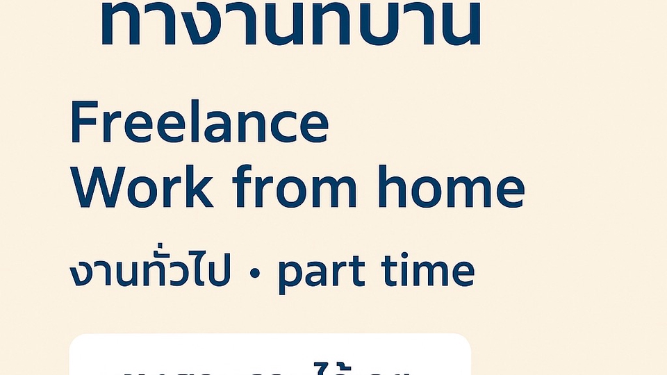 สวัสดีค่ะ เป็นคนทำงานละเอียด ตรงเวลา และตั้งใจทุกงาน รับงานทั่วไป สามารถทำงานทางไกลได้ (Work from home) และยินดีปรับตามความต้องการของลูกค้า 💬 จุดเด่นของฉัน • ตอบแชทไว พูดคุยง่าย • รับผิดชอบงานจนเสร็จสมบูรณ์ • พร้อมปรับแก้งานให้ตามฟีดแบ็ก 💼 ลักษณะงานที่รับ • งานพาร์ทไทม์ / งานทั่วไป