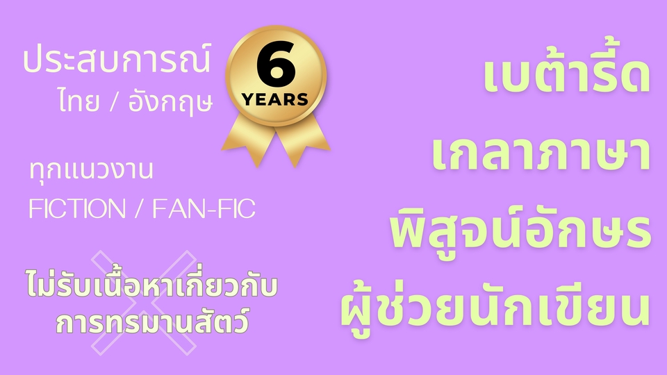 มีประสบการณ์การทำงานให้กับงานนิยายภาษาไทยและภาษาอังกฤษ เป็นเวลา 6 ปี ทั้งแบบบรรยายและแบบแชต ทุกแนว โดยเฉพาะงาน slice-of-life / fantasy / sci-fi / thriller / horror / satire *ประเภทอื่นลูกค้าสามารถติดต่อสอบถามก่อนได้ แต่!! ไม่รับงานเขียนที่มีการบรรยายถึงการตายหรือการทรมานสัตว์* ✔️วางโครงสร้าง / ทรีตเมนต์ / คิดตอนจบ ✔️วิเคราะห์พล็อต เซ็ตติ้ง คาแรกเตอร์ตัวละคร การดำเนินเรื่อง โทนอารมณ์ของเรื่องและตัวละคร ✔️ตรวจสอบความสมเหตุผลของพล็อต เซ็ตติ้ง คาแรกเตอร์ตัวละคร บทสนทนา และชี้จุดปัญหาที่ไม่สมเหตุผล (plot holes) ต่อตัวเรื่อง ✔️เกลาและเรียบเรียงคำ ให้อ่านง่าย สละสลวย ✔️พิสูจน์อักษรไทย / อังกฤษ ✔️เขียนพล็อตเรื่องย่อ ❗️ระยะเวลาการทำงานและราคาค่าบริการขึ้นกับความยากง่ายหรือซับซ้อนของงาน ขั้นตอนการทำงาน 1. บรีฟงานที่ต้องการอย่างละเอียด เพื่อให้เข้าใจความต้องการของลูกค้าชัดเจนที่สุด **หลังการตกลงบรีฟขั้นนี้จะไม่สามารถแก้ไข/เปลี่ยนแปลงได้อีก** 2. ประเมินระยะเวลาการทำงานและราคา โดยราคาขึ้นอยู่กับลักษณะความซับซ้อนของงาน 3. ทำงานผ่านทาง GGdoc หรือ Words 4. ‼️ไม่มีการเปลี่ยนพล็อต ทรีตเมนต์ หรือจุดสำคัญอื่น ๆ นอกเหนือจากการบรีฟขั้นแรก ยกเว้นเป็นข้อมูลที่ขัดแย้งกับเนื้อเรื่อง 5. แก้ไขงานได้ฟรี 1 ครั้ง (แก้ไขดีเทลย่อย ไม่ใช่พล็อตหลักของเรื่อง) นอกเหนือจากนี้ +300 ต่อการแก้ไข 1 ครั้ง