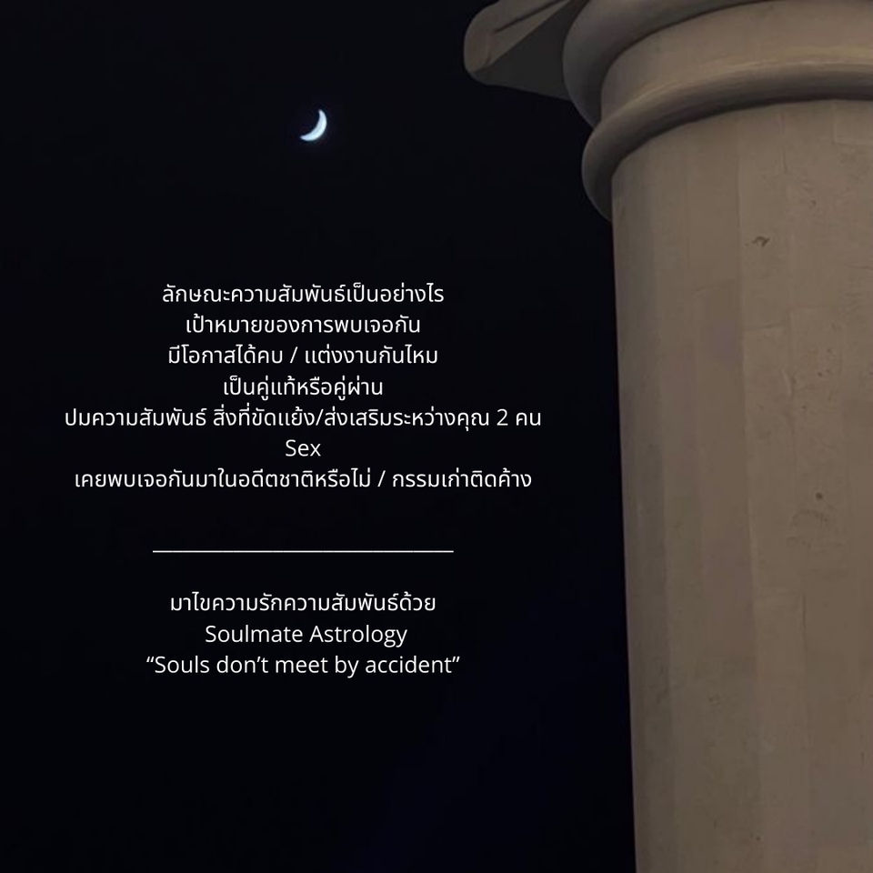 Soulmate Astrology 👩🏻❤️👨🏻 กุญเเจไขความรักความสัมพันธ์ “Souls don’t meet by accident ” มาหาคำตอบด้วยโหราศาสตร์คู่เเท้ จำเป็นต้องใช้ วัน เดือน ปี เเละเวลาเกิดของคุณเเละเขา ในการอ่าน chart หากไม่มีข้อมูลในส่วนนี้จะไม่สามารถ ใช้ศาสตร์นี้ในการดูได้นะคะ ⭐️ สิ่งที่คุณจะได้รับ - ลักษณะความสัมพันธ์เป็นอย่างไร - มีโอกาสได้คบ / เเต่งงานกันไหม - รู้เป้าหมายของการพบเจอกันเพื่ออะไร - Sex - เป็นคู่เเท้ หรือ คู่ผ่าน - ปมความสัมพันธ์ สิ่งที่ขัดเเย้งกันหรือสิ่งที่ส่งเสริมระหว่างคุณ 2 คน - กรรมเก่าติดค้าง เคยพบเจอกันมาในอดีตชาติหรือไม่ ? สิ่งเหล่านี้ตอบได้ด้วย Soulmate Astrology ❤️ ขั้นตอนการทำงาน 1. ลูกค้าส่งข้อมูล วัน เดือน ปี เวลา เเละสถานที่เกิด , สถานะความสัมพันธ์ 2. สร้าง Synastry Chart เเละทำนายด้วย Soulmate Astrology 3. รวบรวมเนื้อหาคำทำนายครอบคลุมทุกประเด็น 4. จัดส่งงานด้วยรูปเเบบไฟล์ PDF