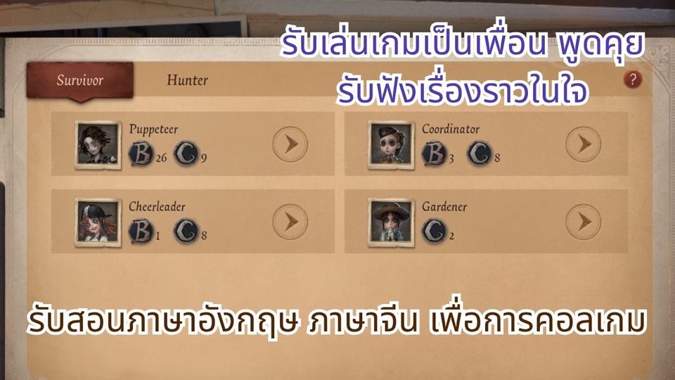 เล่นเกมเป็นเพื่อน Identity V คุยเล่น / รับฟัง/ รับสอนภาษาอังกฤษ จีน เพื่อการสื่อสารคอลเกม