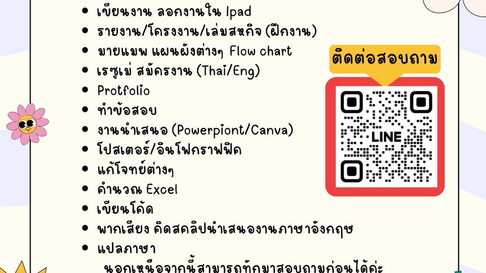 รับทำงานเอกสาร งานพรีเซนต์ งานออกแบบเบื้องต้นแบบครบวงจร เขียนงาน / สรุปเนื้อหา / จัดฟอร์แมตให้เรียบร้อย • รายงาน – โครงงาน – เล่มฝึกงาน – Resume/Portfolio (Eng/ไทย) • งานนำเสนอ (PowerPoint / Canva) ทั้งแบบทางการและน่ารัก • โปสเตอร์ / อินโฟกราฟิก / แบบ Flowchart • คำนวณ Excel – เขียนโค้ดเบื้องต้น – แปลภาษา – ตัดเสียงพากย์คลิปภาษาอังกฤษ • แก้โจทย์ยากๆ / งานเร่ง / งานด่วน รับหมดค่ะ