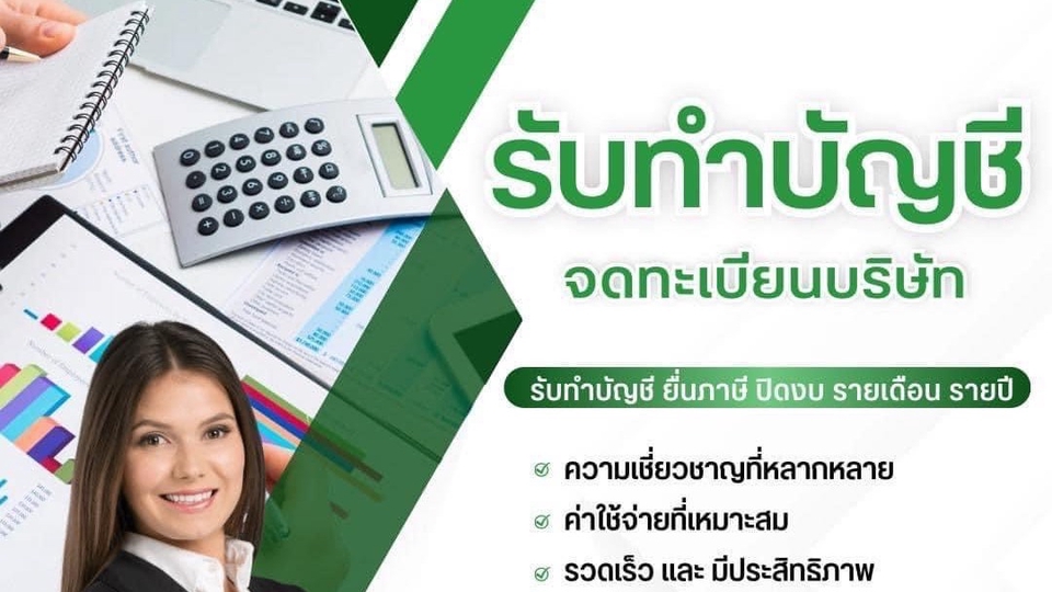 🛎 รับทำบัญชีรายเดือน / รายปี พร้อมยื่นภาษี ปิดงบประจำปี ได้มาตรฐาน ถูกต้อง รวดเร็ว ซื่อสัตย์ ยินดีให้คำปรึกษาก่อนตัดสินใจ ✅ เริ่มต้น ฿1,000 ✅บริการจดทะเบียน ✅บริการจัดทำบัญชี ✅บริการด้านภาษี ✅บริการวางระบบบัญชี ✅บริการเงินเดือนและประกันสังคม ✅บริการจัดทำงบการเงินรายเดือน ✅บริการจัดการอื่นๆ ขั้นตอนการทำงาน 1. คุยรายละเอียด 2. คุยเรื่องเอกสารในการจัดทำ 3. คุยเรื่องราคาการจ้าง 4. รับเอกสาร 5. บันทึกบัญชี 6. แจ้งกำหนดเวลาเสร็จ 7. รับเอกสารได้เลย 8. เป็นการเสร็จสิ้นงาน