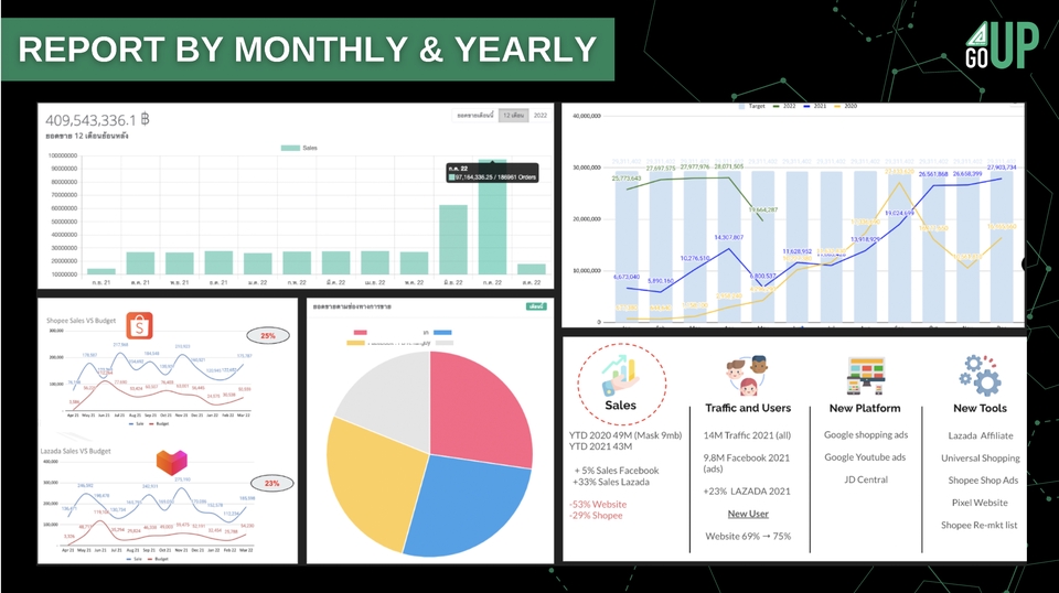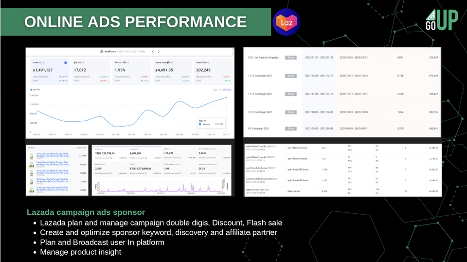 ฿10,000- ยิงโฆษณาตามวัตถุประสงค์และงบประมาณที่ลูกค้าตั้งไว้ 1 ช่องทาง (Shopee, Lazada) สินค้าไม่เกิน 8 SKU - วางกลุ่มเป้าหมายให้เหมาะสมกับสินค้า - Optimization การยิงโฆษณาเพื่อให้ผลลัพธ์เป็นไปตามที่คาดหวัง - ดูแลการเข้าร่วมแคมเปญต่างๆของแพลตฟอร์ม เช่น Double Day, Mid month, Pay Day - ดูแลการสร้าง Code ร้านค้า และการบรอดแคส - เข้าร่วม Affiliate - สรุปผลการดำเนินงานเป็นรายงาน