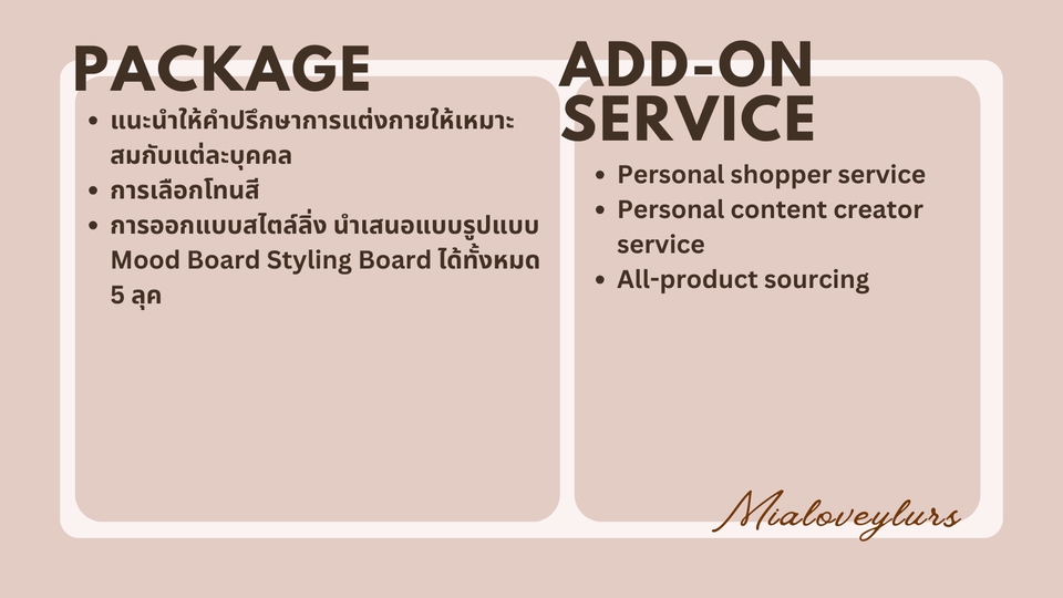 การออกแบบสไตล์การแต่งตัวที่มีความ Unique เพื่อตอบโจทย์ลูกค้าในทุกโอกาส! ด้วยการสร้าง Mood Board รวมถึงการ Styling แสดงไอเดียการจับคู่เสื้อผ้าให้เข้ากับบุคลิกและสถานที่ของแต่ละโอกาส รวมถึงการใช้บริการ Personal Shopper ที่จะช่วยค้นหาสินค้าที่ตรงใจคุณในราคาที่คุณต้องการ ไม่ว่าจะโอกาสใดก็ตาม ขั้นตอนการทำงาน 1. พูดคุยทำความรู้จักกับลูกค้า เพื่อสามารถปรับลุคได้เหมาะสม 2. การออกแบบสไตล์ลิ่ง นำเสนอแบบรูปแบบ Mood Board Styling Board ได้ทั้งหมด 5 ลุค 3. แนะนำให้คำปรึกษาการแต่งกายให้เหมาะสมกับแต่ละบุคคล 4. ปรับแก้พูดคุยแก้ไขงานตามที่ลูกค้าต้องการหลังจากมีการนำเสนองานไปแล้ว 1 ครั้ง 5. จบงาน