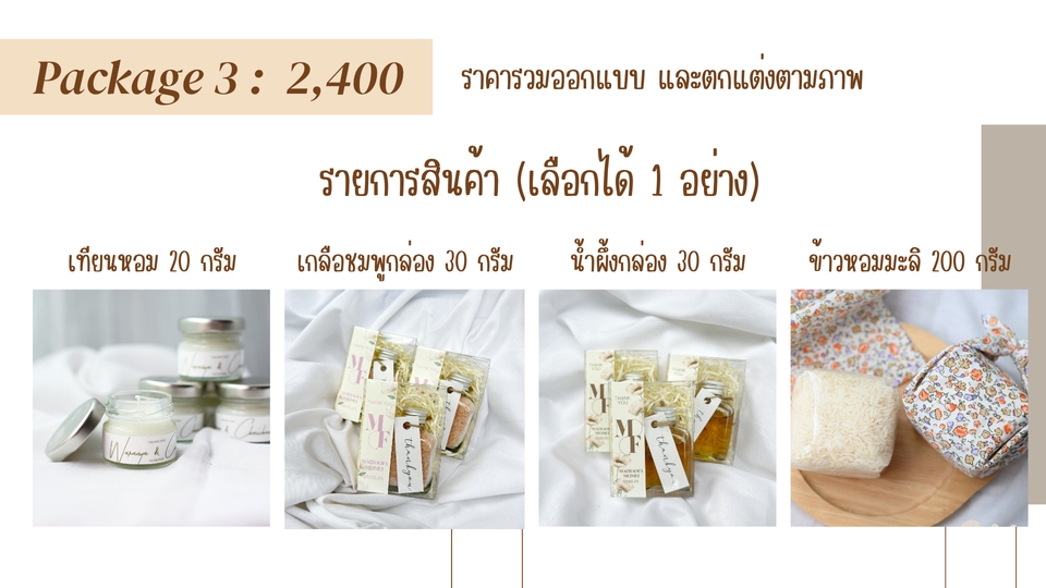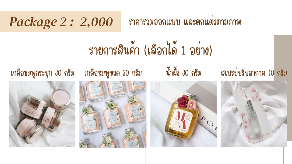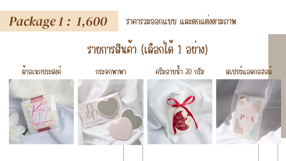 ฿2,000ของชำร่วย พร้อมของตกแต่ง ทั้งหมด 100 ชิ้น (รวมออกแบบสติ๊กเกอร์)