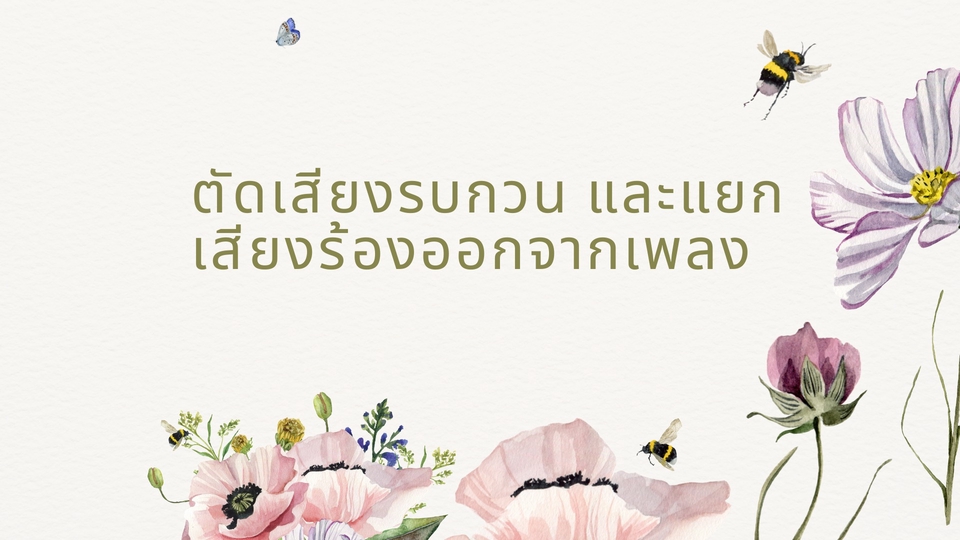 บริการตัดเสียงรบกวน และแยกเสียงร้องออกจากเพลง รายละเอียดงาน ตัดเสียงรบกวน (Noise Reduction): ปรับปรุงคุณภาพเสียงจากไฟล์เสียงหรือวิดีโอ ด้วยการลบเสียงรบกวน เช่น เสียงลม เสียงฮัม หรือเสียงฉากหลังที่ไม่ต้องการ แยกเสียงร้อง/แยกดนตรี (Vocal/Music Separation): แยกเสียงร้องออกจากเพลง หรือแยกเฉพาะเสียงดนตรี เพื่อใช้ในการรีมิกซ์ ทำคาราโอเกะ หรือโปรเจกต์อื่น ๆ ปรับแต่งเสียง (Audio Enhancement): ปรับเสียงให้ชัดขึ้น สมูท และสมดุลมากขึ้น เหมาะสำหรับการใช้งานในงานพรีเซนต์ พอดแคสต์ หรือคอนเทนต์ออนไลน์ ประสบการณ์และความเชี่ยวชาญ ประสบการณ์มากกว่า 5 ปีในด้าน Sound Editing และ Audio Restoration เชี่ยวชาญในโปรแกรมเฉพาะทาง เช่น iZotope RX , Pro Tools , Logic pro x มีผลงานทั้งในงานเพลง โปรเจกต์ภาพยนตร์ วิดีโอ YouTube และคอนเทนต์ออนไลน์ต่าง ๆ ขั้นตอนการทำงาน พูดคุยเพื่อเข้าใจวัตถุประสงค์ของไฟล์เสียง รับไฟล์เสียง/วิดีโอเพื่อตรวจสอบคุณภาพ ดำเนินการตัดเสียงรบกวน หรือแยกเสียงตามความต้องการ ส่งตัวอย่างไฟล์เพื่อให้ลูกค้าตรวจสอบ แก้ไขตามคำแนะนำ (ถ้ามี) และส่งมอบไฟล์ที่สมบูรณ์ สิ่งที่ต้องการจากผู้ว่าจ้าง ไฟล์เสียงหรือวิดีโอต้นฉบับ (คุณภาพสูงจะได้ผลลัพธ์ดีที่สุด) จุดประสงค์การใช้งาน เช่น ใช้ทำคาราโอเกะ หรือใช้งานเชิงพาณิชย์ ความต้องการเฉพาะ เช่น ตัดเฉพาะเสียงพื้นหลัง หรือแยกเฉพาะเสียงร้อง ข้อกำหนดและเงื่อนไข ไม่รับงานที่เกี่ยวข้องกับการพนัน สื่อลามก และเนื้อหาผิดกฎหมาย ราคาขึ้นอยู่กับความยาวและความซับซ้อนของไฟล์เสียง ส่งงานภายใน 1-2 วัน