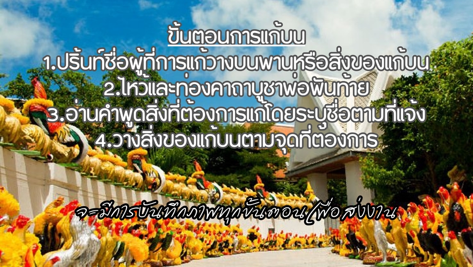 🙏 รับแก้บนศาลพ่อพันท้าย – ทำแทนได้อย่างถูกต้อง ครบขั้นตอน และถ่ายรูปให้ทุกขั้นตอน สำหรับท่านที่ไม่สะดวกเดินทางไปศาลพ่อพันท้ายด้วยตนเอง เราบริการ บนให้ แก้บนแทน ด้วยความตั้งใจและเคารพต่อสิ่งศักดิ์สิทธิ์ที่สุด 📌 สิ่งที่เราบริการให้ ไก่ 1 คู่ ตามประเพณีการแก้บน ราคาตามขนาด ปริ้นท์ชื่อ–นามสกุลของผู้ว่าจ้าง พร้อมคำอธิษฐานหรือเรื่องที่สำเร็จ ติดป้ายชื่อลงบนของแก้บนอย่างเรียบร้อย จัดเตรียมดอกไม้–ธูป–เทียน ให้ครบทุกขั้นตอน ทำพิธีไหว้ พร้อมท่องคาถาพ่อพันท้าย ให้ครบถ้วน กล่าวบอกเล่า “เรื่องที่สำเร็จแล้ว” ตามที่ผู้ว่าจ้างแจ้งให้ ถ่ายรูปทุกขั้นตอน ตั้งแต่เริ่มวางของ–จุดธูป–กล่าวคาถา–ถวายของ ส่งรายงานรูปภาพให้ลูกค้าดูพร้อมคำอธิบายหลังทำพิธีเสร็จ 💮 จุดเด่นบริการของเรา ทำด้วยความตั้งใจ เคารพศาลพ่อพันท้าย ไม่เร่งรีบ ใช้ของไหว้ใหม่ สะอาด และครบถ้วน ลูกค้าสามารถบอกเรื่องที่ขอสำเร็จมาให้เราพูดแทนได้ ให้ความสำคัญกับความเรียบร้อยและความศรัทธาของผู้จ้างเป็นอันดับแรก 📍 เหมาะสำหรับ คนที่ไม่มีเวลา ไม่สะดวกเดินทาง อยู่ต่างจังหวัด/ต่างประเทศ ต้องการแก้บนให้ถูกต้องตามประเพณี