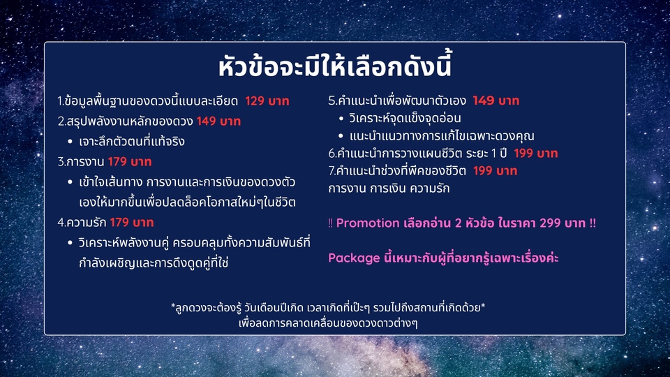 ฿299เลือก2หัวข้อ 1.ข้อมูลพื้นฐานของดวงนี้แบบละเอียด 2.สรุปพลังงานหลักของดวง 3.การงาน 4.ความรัก 5.คำแนะนำเพื่อพัฒนาตัวเอง 6.คำแนะนำการวางแผนชีวิต ระยะ 1 ปี 7.คำแนะนำช่วงที่พีคของชีวิต การงาน การเงินความรัก