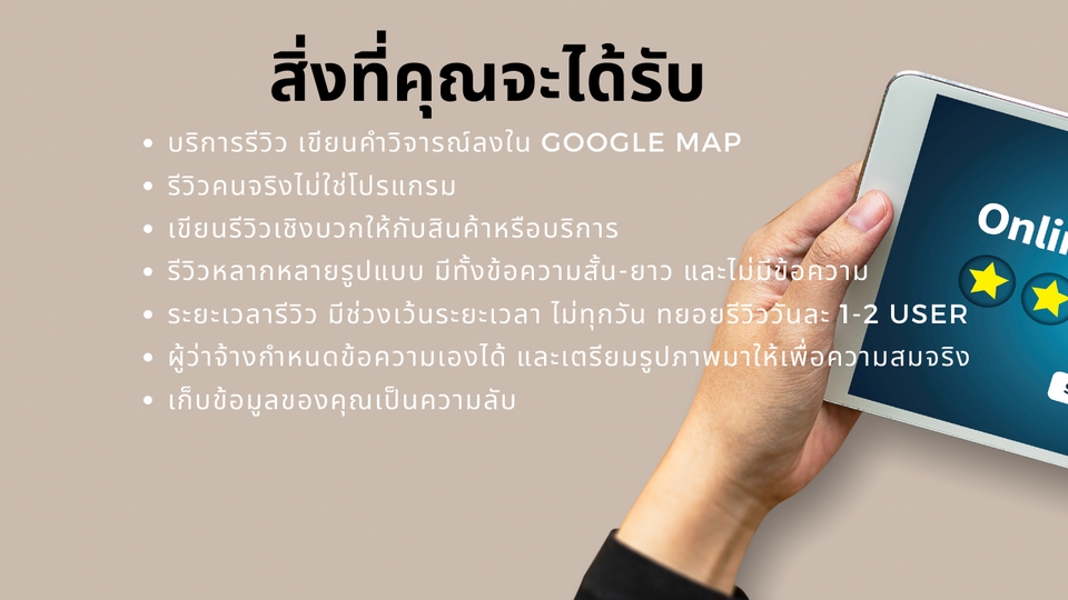 ฿599- บริการรีวิว เขียนคำวิจารณ์ลงใน Google map - 10 ไอดี ภายใน 10-20 วัน - รีวิวคนจริงไม่ใช่โปรแกรม - เขียนรีวิวเชิงบวกให้กับสินค้าหรือบริการ - รีวิวหลากหลายรูปแบบ มีทั้งข้อความสั้น-ยาว และไม่มีข้อความ - ระยะเวลารีวิว มีช่วงเว้นระยะเวลา ไม่ทุกวัน ทยอยรีวิววันละ 1-2 User - ผู้ว่าจ้างกำหนดข้อความเองได้ และเตรียมรูปภาพมาให้เพื่อความสมจริง - เก็บข้อมูลของคุณเป็นความลับ