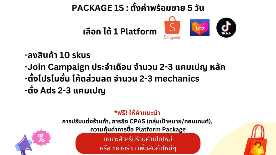 ฿4,990เลือกได้ 1 Platform : Shopee หรือ Lazada หรือ Tiktok *รายละเอียดในรูปภาพ* -ราคานี้ไม่รวมค่าโฆษณา (Ads) -ไม่เกิน 20 SKUs