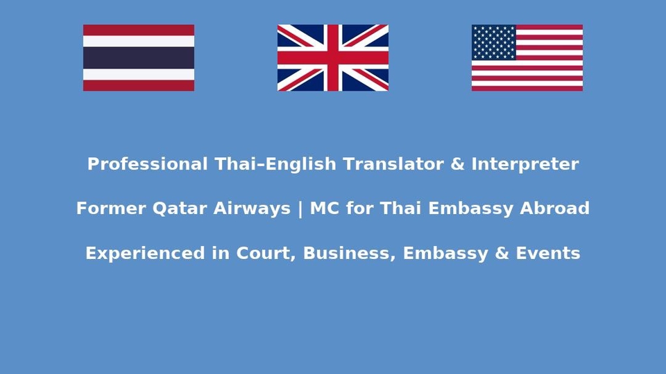 🌟 Professional Thai–English Translator & Interpreter | Former Qatar Airways | Master of Ceremonies (MC) for Thai Embassy | Experienced in Court, Business, Embassy, and Event Settings 🌟 🌟 นักแปล–ล่าม ไทย–อังกฤษ มืออาชีพ อดีตพนักงาน Qatar Airways และพิธีกร (MC) สถานทูตไทย ประสบการณ์ตรงด้านศาล ธุรกิจ สถานทูต และงานอีเวนต์ 🌟