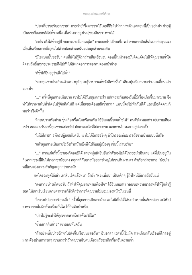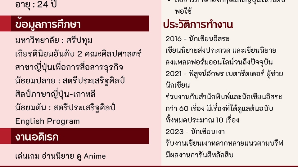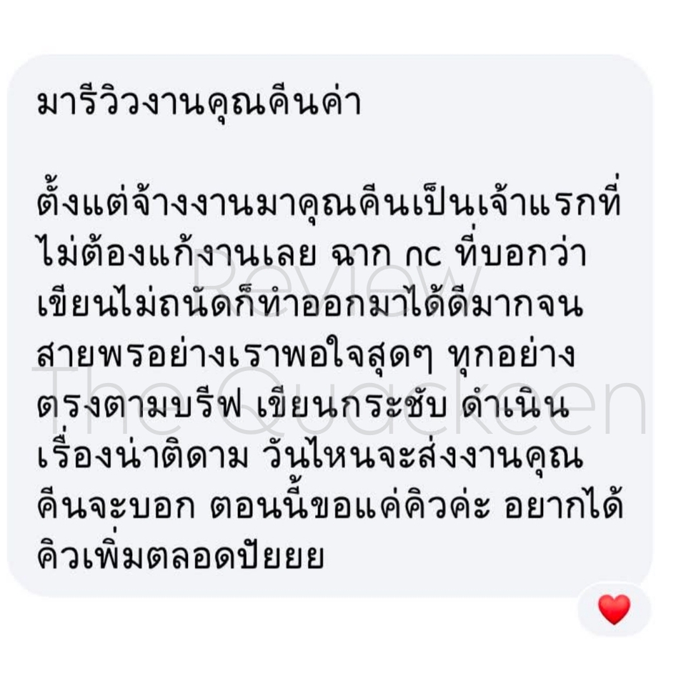 แนวที่รับ ดราม่า โรมานซ์ พีเรียดไทย PWP คอเมดี้ แนวที่ไม่ถนัด แฟนตาซี สยองขวัญ พีเรียดจีน ตะวันตก ชายหญิง ชายชาย หญิงหญิง รับทุกแนว ราคารวมเชิงพาณิชย์คำละ 0.4 บาท งานเร่ง x2 จำนวนคำต่อตอน เรื่องสั้นไม่เกิน 3000 คำ เรื่องยาว ไม่เกิน 5000 คำ ถ้าไม่มีพล็อตมาให้ มีค่าพล็อตเพิ่ม 100-300 บาท (ขึ้นอยู่กับความยากง่ายของพล็อต) ค่าวางทรีตเมนต์คิดแยกต่างหาก (ตอนละไม่เกิน 20 บาท) ถ้ามีพล็อตและทรีตเมนต์มาแล้ว สามารถพูดคุยหรือขอคำแนะนำให้ปรับเปลี่ยนได้ ไม่มีค่าใช้จ่ายเพิ่มเติมในส่วนนี้ ถ้าเป็นงานที่มีการรีเสิร์ชสำหรับการเขียน มีค่าบริการเพิ่มเติม ขึ้นอยู่กับความยากง่ายของการค้นคว้า ถ้ามีเปเปอร์สรุปมาแล้ว ไม่มีค่าบริการเพิ่มเติม ขั้นตอนการทำงาน 1. คุยบรีฟและร่างสัญญา กรณีไม่ร่างสัญญา สามารถทำได้ แต่ไม่สามรถผ่อนชำระได้ 2. ชำระมัดจำ 3. เริ่มอัปเดตให้รายตอน ส่งงานเป็น pdf ตรวจสอบความถูกต้อง แก้ไขงาน 4. หลังตกลงรับงาน ชำระเงินส่วนที่เหลือ ส่งงานต้นฉบับเวิร์ด