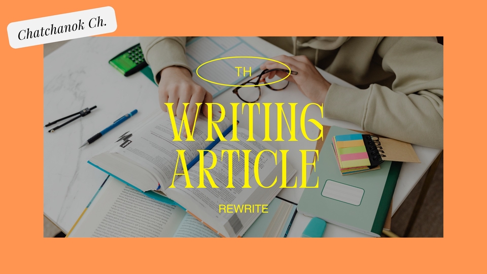 บริการรับเขียนบทความภาษาไทย จากข้อมูลที่ลูกค้ามีให้หรือจากการค้นหาข้อมูลเพิ่มเติม แล้วนำมาเรียบเรียงใหม่เป็นบทความต่อเนื่องที่สมบูรณ์ โดยผู้เขียนที่มีประสบการณ์เขียนบทความวิชาการ สรุปเสวนา และบทสัมภาษณ์ ขั้นตอนการทำงาน 1. รับบรีฟงานต้นฉบับเพื่อประเมินราคาและระยะเวลา 2. เริ่มร่างโครงเรื่อง 3. เรียบเรียงข้อมูล 4. ส่งมอบงานครั้งที่ 1 เพื่อให้ลูกค้ารีวิว 5. แก้ไขจนบทความเสร็จสมบูรณ์ 6. ส่งมอบงานแปลครั้งสุดท้ายให้ลูกค้า