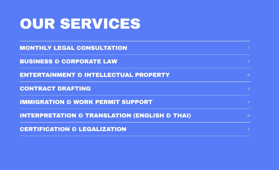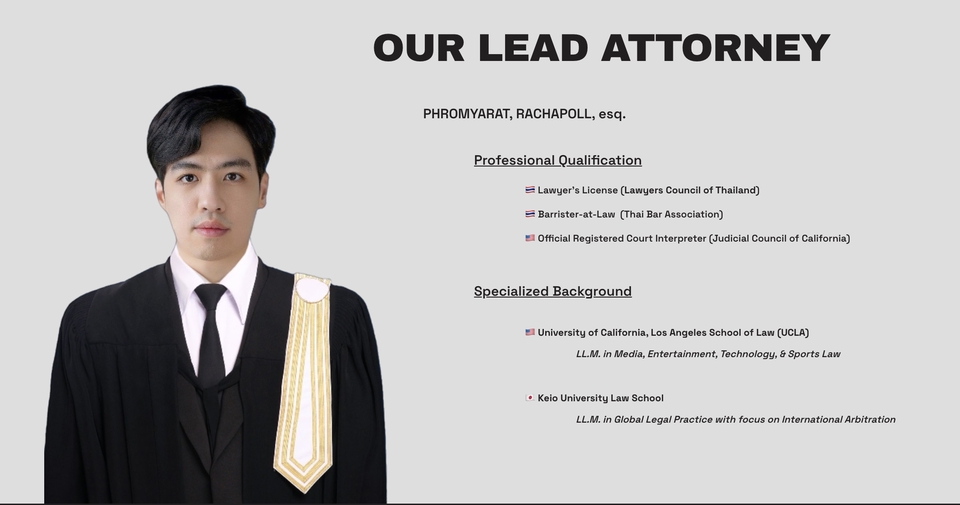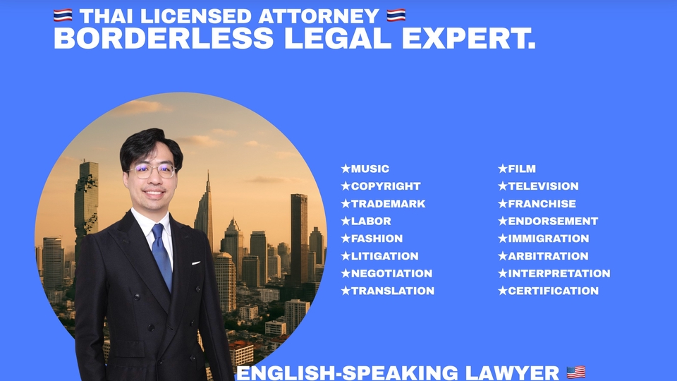 🎓 Graduated from law schools in both Thailand and the United States 🌏 Fluent in English and Thai 📑 Specializing in legal drafting, translation, and contract review 🎬 Experienced in Entertainment Law, Intellectual Property, Business Law, and Immigration Law ⚖️ Trusted by well-known clients who need assistance in legal matters that meet both Thai and international standards