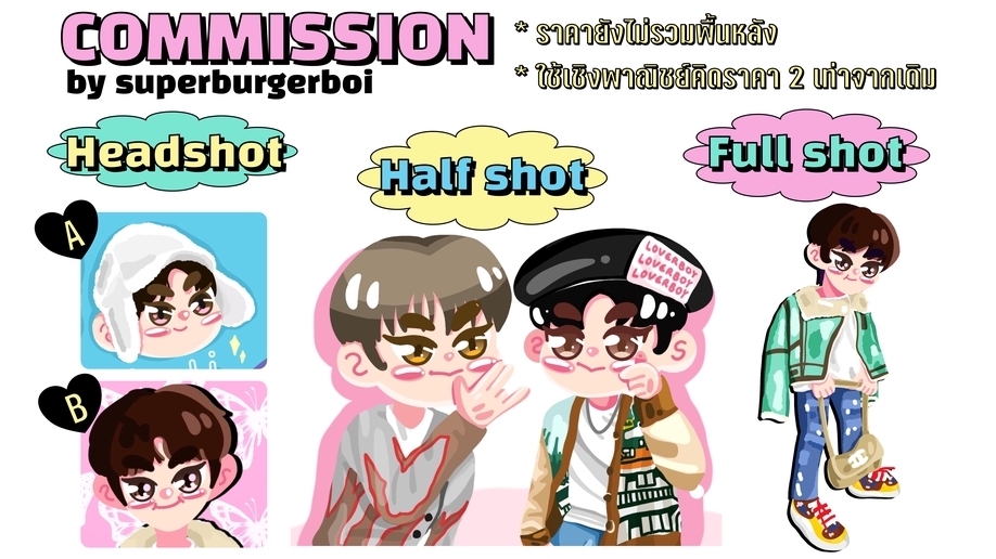คุณสามารถให้เราวาดศิลปินหรือดาราคนไหนก็ได้ พร้อมพื้นหลัง หรือ จะไม่เอาก็ได้นะคะ โดยที่รูปที่คุณให้เราวาดจะไม่ทำให้ศิลปิน/ดาราคนนั้นเสียหายในทุกทาง ✧ ₊˚ ꒱ ‧⁺ ขั้นตอนการทำงาน 1. ระบุบุคคลที่จะให้วาด 2. ระบุความต้องการว่าจะให้เปลี่ยนท่าทางของตัวละครตามความต้องการหรือไม่ 3. ระบุพื้นหลังว่าต้องการหรือไม่ต้องการ ถ้าต้องการ ต้องการแบบไหน 4. โปรดระบุถ้าใช้ในเชิงพาณิชย์