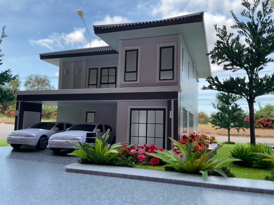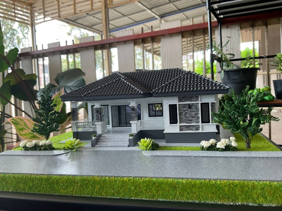 โมเดลบ้าน ขนาดสเกล 1:33 มีเฟอร์ภายใน มีไฟ ทำสีเสมือนจริง พร้อมจัดสวนตามแบบ มีครอบอะคริลิคใสความหนาของครอบขึ้นอยู่กับขนาดสเกลของงาน ทางเราใช้วัสดุอย่างดีในการทำงาน