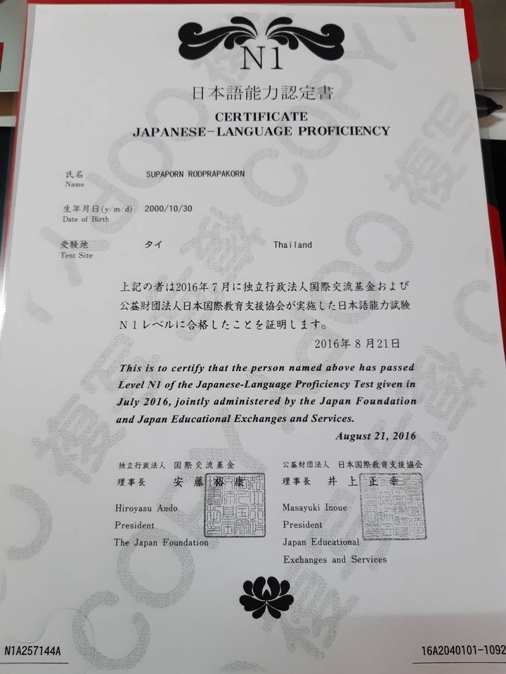 - สอบผ่าน การวัดระดับภาษาญี่ปุ่น ระดับ N1 - เรียนในคณะมนุษยศาสตร์เอกภาษาญี่ปุ่น โดยได้เรียนในด้านการแปลภาษาในส่วนบทความ หนังสือโดยประกอบไปด้วยหนังสือเกี่ยวกับทางการแพทย์ นิทาน นิยาย เรื่องสั้น และได้เรียนในด้านการล่าม - มีประสบการณ์ในการล่ามและแปล(เอกสาร อนิเมะแบบสั้น) นอกจากในการเรียน
