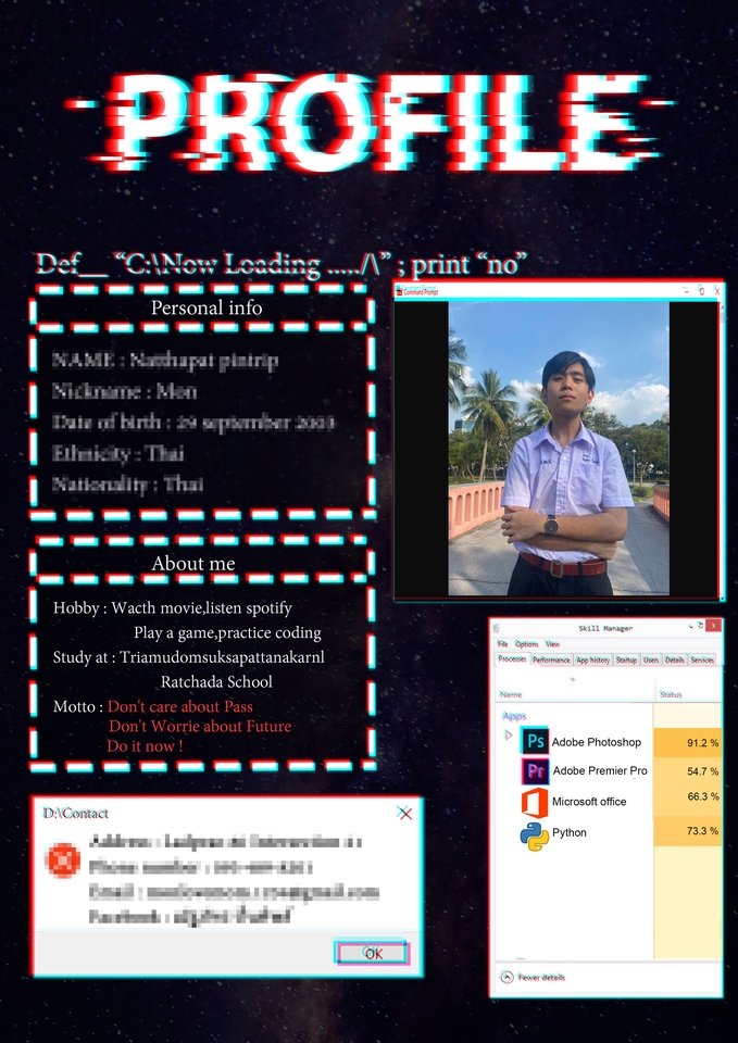 สวัสดีครับ ผมม่อน เป็นนักศึกษาที่มหิดลคณะ ICT โดยการติดจากรอบพอร์ต ผมเชื่อว่า Portfolio ที่ดีจะทำให้กรรมการของแต่ละมหาลัยสนใจมากขึ้น และ ยังแสดงความเป็นตัวตนของตัวเองได้มากขึ้น ขั้นตอนการจ้างงาน: 1. คุยรายละเอียดราคา/รายละเอียด style,tone หรือมี reference ก็จะดีมากครับ 2. เตรียมไฟล์ที่สำคัญเช่น รูป, รายละเอียด (ชื่อ,ประวัติ,etc..), ผลงานที่ต้องการนำมาใส่ 3. เริ่มงานจะใช้เวลาประมาณ 1-5 วันแล้วแต่ความยากของงานนั้นๆ 4. ตรวจสอบ งานลูกค้าจะสามารถเป็นแก้งานได้ 3-5 ครั้งแล้วแต่รายละเอียดข้อการแก้ไข 5. ส่งมอบงานลูกค้าจะขอไฟล์เป็น JPG PNG PDF หรือ PSD ได้หมดเลยครับ (การทำงานทั้งหมดจะส่วนใหญ่จะใช้โปรแกรม Photoshop) ขั้นตอนการทำงาน 1. คุยรายละเอียดราคา/รายละเอียด style,tone หรือมี reference ก็จะดีมากครับ 2. เตรียมไฟล์ที่สำคัญเช่น รูป, รายละเอียด (ชื่อ,ประวัติ,etc..), ผลงานที่ต้องการนำมาใส่ 3. เริ่มงานจะใช้เวลาประมาณ 1-5 วันแล้วแต่ความยากของงานนั้นๆ 4. ตรวจสอบ งานลูกค้าจะสามารถเป็นแก้งานได้ 3-5 ครั้งแล้วแต่รายละเอียดข้อการแก้ไข 5. ส่งมอบงานลูกค้าจะขอไฟล์เป็น JPG PNG PDF หรือ PSD ได้หมดเลยครับ