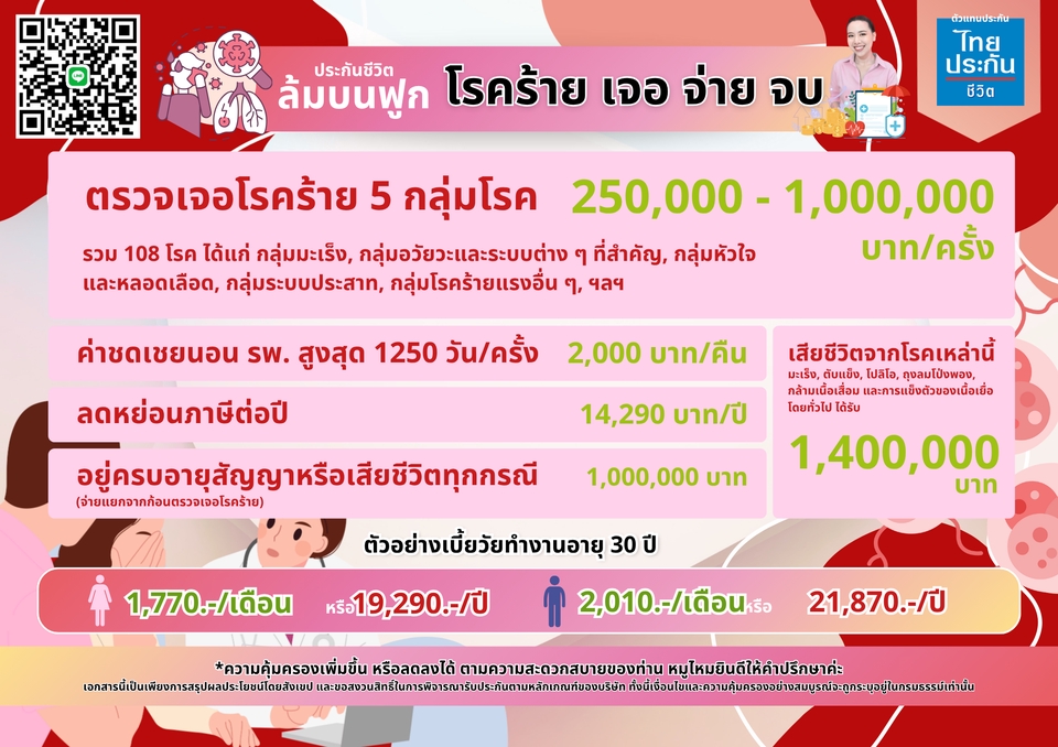 ฿500คุ้มครองแบบระยะยาว ตรวจเจอ จ่ายเลย ครอบคลุมทุกระยะของโรคร้ายแรง 5 กลุ่มโรค รวม 100 กว่าโรค ความคุ้มครองเริ่มต้น 500,000 บาท - ตามที่เราต้องการ แอดมิด รพ. ขาดรายได้ มีเงินชดเชยทุกวันสูงสุด 365 วัน ✨
