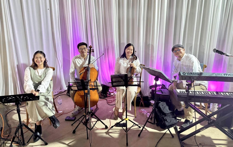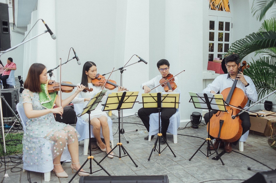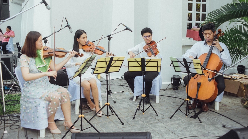 งานของเรามีดนตรีใช้ประการในพิธีการหลายแบบ 1.String Quartet (ไวโอลิน2 วิโอล่า เซลโล่) 2.Piano Trio (ไวโอลิน เซลโล่ เปียโน) 3.Violin Piano 4.Voice Piano Violin หรือตามผู้จ้างต้องการ เหมาะแก่การสร้างบรรยากาศ งานแต่ง เปิดงาน จัดงานเลี้ยง เป็นต้น