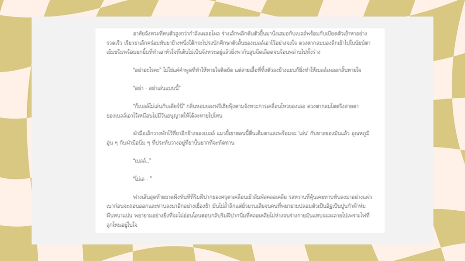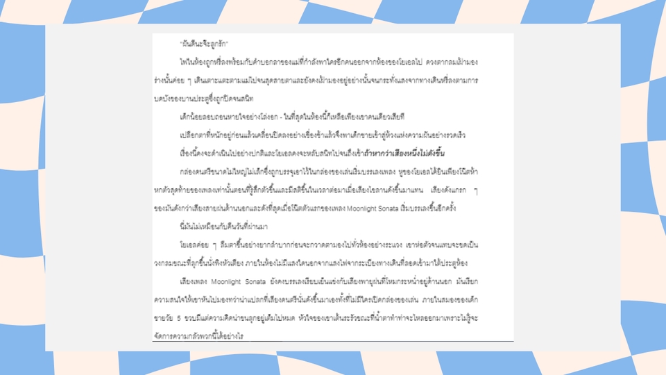 รับเขียนนิยาย แฟนฟิค เรื่องสั้นทุกประเภท ประเภทงานที่รับ BL GL HL Fanfiction OCxCanon แฟนด้อมที่ถนัด: Harry Potter, EXO, NCT, Haikyuu, Attack On Titan, One Piece, SpyxFamily สำหรับด้อมอื่น ๆ สามารถสอบถามเบื้องต้นก่อนได้ หรือทางผู้ว่าจ้างสามารถจัดทำเอกสารรายละเอียดที่จำเป็นต้องทราบเพื่อประกอบการเขียนให้ทางผู้เขียนได้ค่ะ แนวงานที่รับ (ตามลำดับความถนัด): - Horror, Paranormal - Fantasy: Dark Fantasy, Magical Realism, Grimdark, Low Fantasy - Romantic, RomCom - Fluffy - Angst - Period รับเฉพาะพีเรียดไทยและอเมริกาค่ะ โซนอังกฤษและไอร์แลนด์สามารถสอบถามเพิ่มเติมได้ค่า ส่วนพีเรียดจีนไม่ได้รับนะคะ ♥ แนวงานที่ไม่ได้รับ Incest Rape Pedo Sci-Fi หากแนวที่สนใจไม่ได้ในลิสต์ด้านบน แวะเข้ามาสอบถามได้เลยน้า ตัวอย่างงานเพิ่มเติม https://docs.google.com/document/d/1vMczuEaMSUmh8f_WxaNWNPUt8ZIGCJdRCvI_Vw7SKik/edit?usp=sharing ผู้ว่าจ้างแจ้ง Plot โดยละเอียด พร้อมข้อมูลเซ็ตติ้งและตัวละคร ทางเรามีแบบฟอร์มสำหรับรายละเอียดตัวละคร สามารถขอรับได้ค่ะ แจ้งมุมมองเนื้อเรื่อง และสรรพนามแทนตัวของตัวละคร (หากส่วนนี้มีรายละเอียดปลีกย่อยให้เขียนไว้ภายในข้อมูลตัวละคร เช่น ตัวละคร A แทนทุกคนว่าเธอ แต่แทนตัวละคร B ตัวชื่อจริงเท่านั้น เป็นต้น) แจ้ง Mood&Tone ของเรื่อง ในส่วนนี้สามารถยกตัวอย่างงานเขียน คลิปวิดีโอ หนัง หรือสื่ออื่น ๆ ประกอบได้ค่ะ ผู้เขียนจะส่งงานให้ตรวจสอบ 1 ครั้งเมื่อเขียนได้ 50% ผู้ว่าจ้างสามารถฟีดแบคเพื่อปรับแก้ได้ 1 ครั้ง และสามารถแก้ไขภาพรวมได้อีก 1 ครั้งหลังส่งงานไฟนอล หากต้องการแก้ไขเพิ่มเติม คิดเพิ่มครั้งละ 50 บาทค่ะ