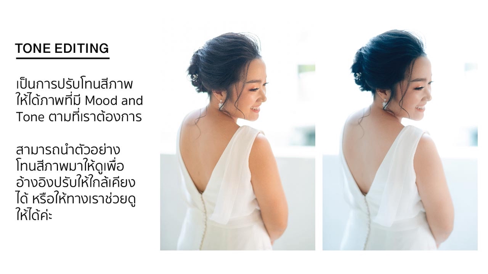 ประสบการณ์ปรับแสงภาพถ่ายให้เป็นธรรมชาติกับ Wedding Studio นานกว่า 5 ปี หากคุณเหนื่อยกับการทำภาพจำนวนมาก ให้เราทำแทนคุณ รวมถึงงานรีทัชผิวและรูปร่างอย่างเป็นธรรมชาติ หรือทำโทนสีภาพตามต้องการ ขั้นตอนการทำงาน 1. พูดคุยรูปแบบ และสโคปงาน 2. อัพโหลดไฟล์ที่ต้องการให้ทำ ส่งทาง online หรือเซฟไฟล์ลง hard disk มาทาง ปณ. 3. เมื่อได้รับไฟล์ เริ่มทำภาพตามตกลง เริ่มนับวันส่งงานหลังจากวันที่ได้รับไฟล์ 4. ส่งตัวอย่างไฟล์ขนาดเล็กให้ดูทางออนไลน์ สามารถปรับแก้ได้ 1 ครั้ง (การปรับแก้เฉพาะแพคเกจทำโทนกับรีทัชเท่านั้น) 5. หากไม่มีการแก้ไข จะทำการส่งไฟล์จริงในวันถัดไป แต่หากมีการแก้ไข อาจมีการเลื่อนกำหนดส่งตามแต่ตกลงอีกครั้งค่ะ