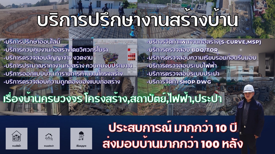 หากท่านคิดจะสร้างบ้าน หรือดำเนินการสร้างแล้วยังไม่มั่นใจ ว่าบ้านของท่านจะออกมาดี และมีคุณภาพ การควบคุมงานก่อสร้าง ต้องมีความยืดหยุ่น และวิเคราะห์สถานะการณ์ได้ดี เพื่อไม่ให้ก่อให้เกิดความเสียหายที่ตามมา เช่น ช่างทิ้งงาน,งานไม่ได้คุณภาพ เราจึงมีบริการดังต่อไปนี้ 1. บริการปรึกษาออนไลน์ (ปรึกษา ให้คำแนะนำฟรีครับ) - เป็นบริการที่เจ้าของบ้านสามารถสอบถามปัญหาแนวทางเบื้องต้น และสถานการณ์เฉพาะหน้า โดยที่ใช้วิธีการสอบถามผ่านแชท หรือโทรผ่านApp Fastwork 2.บริการปรึกษาออนไซต์ - ระดับความเข้มข้นจะมากกว่าออนไลน์ ซึ่งบางปัญหาไม่สามารถอธิบายด้วยคำพูดได้ จึงมีบริการเยี่ยมชมไซต์งาน หรือพื้นที่หน้างานจริง เพื่อให้คำปรึกษา 3.บริการรีวิว สัญญาจ้าง งวดงาน และ BOQ - บ่อยครั้งที่เจ้าของบ้านเสียรู้ช่าง เบิก Advance ไปแล้ว แต่งานกลับล่าช้า เพื่อไม่ให้เสียรู้ช่างจึงมีบริการรีวิวสัญญาจ้าง และการแบ่งงวด เพื่อไม่ให้เจ้าของบ้านเสียเงินเกินความจำเป็น 4. บริการควบคุมงานก่อสร้าง จัดทำแผนงานก่อสร้าง - ในบ้างครั้งการจ้างวิศวกร หรือโฟร์แมนประจำ จะมีค่าใช้จ่ายที่มากเกินไป และเป็นภาระ จะดีกว่าไหม ถ้าเจ้าของบ้านมีวิศวกร ที่เข้ามาตรวจสอบงานให้ในทุกเหตุการณ์สำคัญ เช่น ตรวจสอบระดับ ตรวจสอบไลน์ ตรวจสอบเหล็กก่อนเข้าแบบ ตรวจสอบความเรียบร้อยก่อนเทคอนกรีต ฯลฯ ขอขอบคุณที่สนใจบริการจนถึงตอนนนี้ ทักเลยครับ ขั้นตอนการทำงาน 1. พูดคุยปรึกษา สอบถามความต้องการ 2. เริ่มให้คำปรึกษา 3. เมื่อได้รับคำปรึกษาแล้วสิ้นสุดการทำงาน