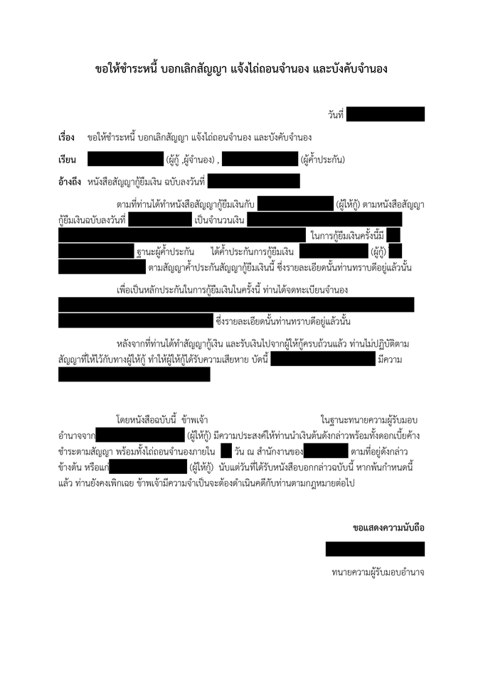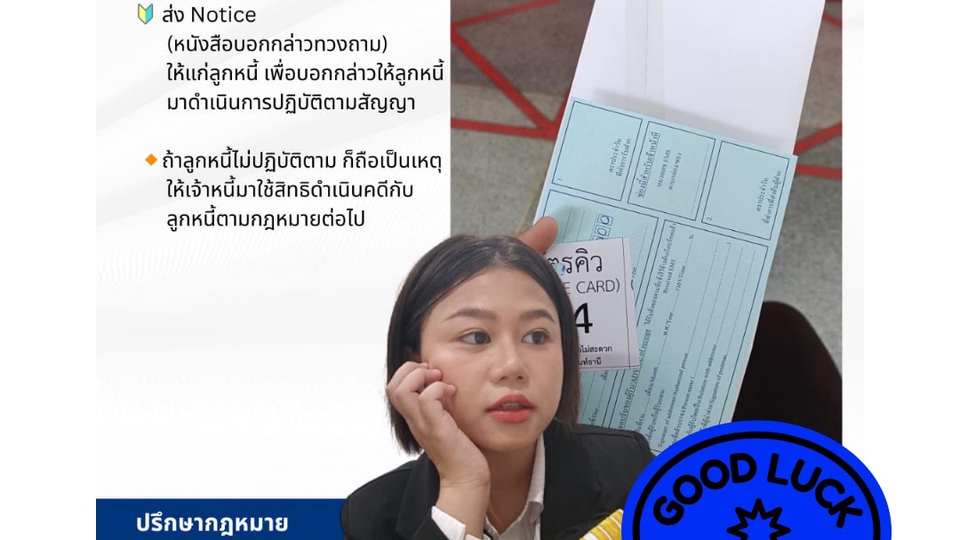 หนังสือบอกกล่าทวงถาม / notice letter - หนังสือบอกกล่าวให้ชำระหนี้ตามสัญญา หรือให้คู่สัญญาปฏิบัติตามสัญญา - บอกเลิกสัญญาโดยชอบด้วยกฎหมาย เพื่อใช้เป็นหลักฐานเอกสารในการดำเนินคดีตามกฎหมาย เช่น สัญญากู้ยืมเงิน /สัญญาจะซื้อจะขาย / สัญญาเช่าซื้อ และอื่นๆ รายละเอียด 1. รับข้อมูล เพื่อใช้ในการทำหนังสือทวงถาม แนบหลักฐาน (ถ้ามี หรือ จำเป็นต้องใช้ประกอบเอกสาร) 2. ส่งหนังสืบอกกว่า พร้อม ใบตอบรับของไปรษณีย์ไทย EMS 3. ส่งไฟล์ PDF ให้ผู้ว่าจ้าง ขั้นตอนการทำงาน 1. รับข้อมูล เพื่อใช้ในการทำหนังสือทวงถาม แนบหลักฐาน (ถ้ามี หรือ จำเป็นต้องใช้ประกอบเอกสาร) 2. ส่งหนังสืบอกกว่า พร้อม ใบตอบรับของไปรษณีย์ไทย EMS 3. ส่งไฟล์ PDF ให้ผู้ว่าจ้าง