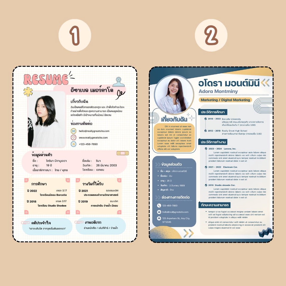 รับทำเรซูเม่ ราคาถูก มีเเบบให้เลือกมากมาย เพียงส่งข้อมูลให้ทางร้าน 1.ภาษาไทย 59 ฿ 2.ภาษาอังกฤษ 99 ฿ (พร้อมแปล) 3.แบบคู่ไทย-อังกฤษ 129 ฿ ————————————— ✅ แก้ไขให้ฟรีจนกว่าจะพอใจ📝 ✅ รองานไม่เกิน 24 ชม. (ด่วนแจ้งได้)⏰ ✅ ส่งงานไฟล์ PNG & PDF 🗂 📬สอบถามรายละเอียดเพิ่มเติมได้ใน INBOX
