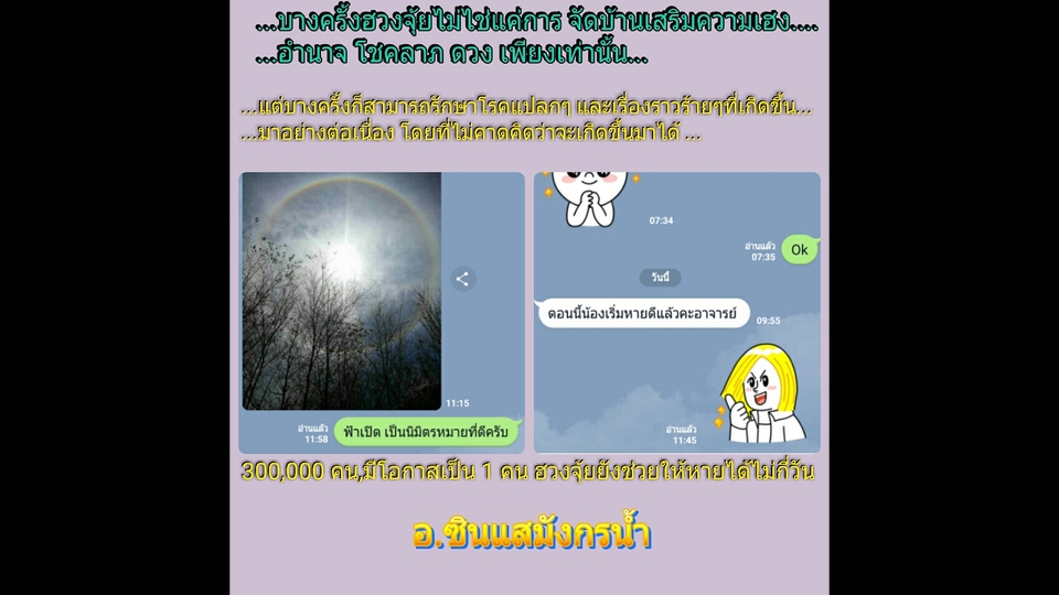 "การจัดฮวงจุ้ย" คือการบริหารจัดการพลังงานที่ฟ้าส่งมา นำมาส่งเสริมคนและสถานที่ เมื่อคนอยู่ในสถานที่นั้นๆ ได้รับพลังงานที่ดีต่อเนื่องเป็นประจำ จึงมีชีวิตที่ดีขึ้นอย่างต่อเนื่อง การคิดการตัดสินใจถูกต้อง ถูกยุค ถูกสมัย หรือที่เรียกว่าถูกที่ ถูกเวลา ก็จะทำให้เจริญรุ่งเรือง ก้าวหน้าอย่างรวดเร็ว... ..."ดั่งคำที่ว่า...หลีกเลี่ยงพลังงานร้าย เสริมสร้างพลังงานดี ชีวิตเป็นสุข... ...เมื่อไหร่ที่ควรต้องจัดฮวงจุ้ย ปรับดวงชะตาชีวิต... 1.มีเรื่องร้ายๆเข้ามาในชีวิต อย่างต่อเนื่อง กิจการงานต่างๆไม่ประสบความสำเร็จ ไม่ก้าวหน้า ครอบครัวป่วยเป็นประจำ ความรัก ความสามัคคี จืดจางลงเรื่อยๆ... -สาเหตุเกิดจาก ได้รับพลังร้ายแบบฉับพลัน หรือต่อเนื่อง ซึ่งเกิดได้หลายช่องทาง เช่น บ้านที่อยู่อาศัย ที่ทำงาน พลังงานไม่ดี หรือโดนพลังร้ายโดยการ เคาะตอก เจาะโดยไม่มีฤกษ์ยาม 2.ต้องการเสริมความเฮงให้มากขึ้น ออกแรงน้อยได้ผลงานมาก สุขภาพแข็งแรง ไม่เสียเงินไปโดยไม่จำเป็น ไม่ซวย ...ฮวงจุ้ยที่ถูกต้อง ไม่งมงาย ไม่ต้องทุบ รื้อ และไม่เกี่ยวข้องกับการบูชาสิ่งศักสิทธิ์ใดๆทั้งสิ้น สามารถสร้างความเจริญรุ่งเรืองได้อย่างรวดเร็ว... รายละเอียดราคาเพิ่มเติม 1.น้ำเต้าดูดทรัพย์เสริม หรือแก้ฮวงจุ้ย ใบละ 900 บาท ( แล้วแต่สมัครใจ จะซื้อไม่ซื้อ ) 2.ไฟ LED กระตุ้นโชค แบบมีรีโมทควบคุม 800 บาท ( แล้วแต่สมัครใจ จะซื้อไม่ซื้อ ) 3.กรุงเทพและปริมณฑล ฟรีค่าเดินทาง 4.ภาคกลาง ตะวันออก ตะวันตก ภาคใต้ตอนบน มีค่ารถเพิ่ม 1,500-2,000 บาท 5.ภาคเหนือ ภาคใต้ตอนล่าง ลูกค้าจองตั๋วเครื่องบินให้เอง หรือซินแสจองเองเก็บเงินตามจริง / และถ้าเดินทางด้วยรถทัวร์ 2,000 - 3,000 บ. แล้วแต่สมัครใจทั้งสองฝ่ายว่าจะเดินทางด้วยวิธีไหน 6.งดเดินทางพื้นที่เสี่ยงภัยต่างๆ ขั้นตอนการทำงาน 1. นัดพบกันที่สถานที่นั้นๆ ตามเวลานัดหมาย 2. ให้ลูกค้า เตรียม วัน เดือน ปี เวลาเกิด คนในครอบครัว หรือ บุคลสำคัญ 3. ตรวจชัยภูมิภาพรวมทั้งหมด วัดองศาจากดาวเทียมเพื่อความแม่นยำ 4. ออกผังบ้าน อาคาร ดวงดาว ทิศทางต่างๆ 5. ตรวจดวง วิเคราะห์ ศักยภาพบุคล ตรวจหาธาตุสำคัญต่างๆ 6. ประชุมกำหนดแผน ยุทธวิธี และลงมือทำ ให้แนะนำ ตามพื้นที่ต่างๆ 7. แนะนำการใช้ วัสดุกระตุ้นโชคที่เจ้าของสถานที่สามารถ จัดหามาได้เอง ตามท้องตลาดทั่วๆไป ราคาไม่แพง 8. ตอบข้อสงสัยต่างๆ แนะนำการเสริมโชค เคล็ดลับ ต่างๆ 9. มอบฤกษ์ยามในการเปลี่ยนแปลง ในเรื่องต่างๆ 10. ส่งมอบงาน และอำลาจากกันด้วยดีต่อไป
