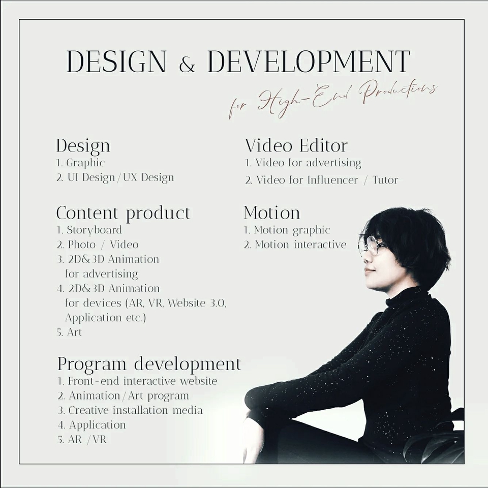 ประสบการณ์ออกแบบและพัฒนาโปรแกรมมากกว่า 6 ปี กว่า 20 โปรเจคทั้งเอกชนและรัฐบาล ในประเทศไทยและต่างประเทศ US/UK สร้างงานด้านครีเอคทีฟ และงานคราฟ มาร่วมกันช่วยตอบโจทย์อนาคตที่ยิ่งใหญ่ด้วยกันค่ะ เมอร์ฟี่มีประสบการณ์ทำงานที่หลากหลายและร่วมทีมทำงานทั้งงานกับองค์กรรัฐ เอกชนมากกว่า 5 ปี โปรเจคกว่า 20 โปรเจค มีประสบการณ์หลากหลายด้าน ผู้ร่วมงานกลับมาร่วมงานกับเราหลายโปรเจค แสดงถึงความน่าเชื่อถือ มั่นใจในการทำงานและคุณภาพ ✨ สำหรับปีนี้เราวางแผนอย่างหนักเพื่อที่จะพร้อมเป็นผู้ร่วมงานที่มีคุณภาพสูง ร่วมงานกับลูกค้าระดับ High end สร้างผลงานที่เป็นมากกว่า ชิ้นงานเพื่อการตลาด แต่จะเป็นชิ้นงานศิลปะ ที่มีคุณค่า มีความหมาย 💖 จุดเด่นเราเน้นไปที่ การครีเอคทีฟงาน การออกแบบ งานศิลปะ สื่อวีดีโอโมชั่น โฆษณา กราฟฟิค และนำคอนเทนมาร่วมกับการใช้เทคโนโลยี ทั้ง แอพลิเคชั่น เว็บไซต์ และอื่นๆ เพื่อเพิ่มมูลค่า คุณค่า ให้สินค้าและบริการของคุณ ขั้นตอนการทำงาน 1. รับปรีฟงานและรายละเอียด 2. ออกแบบ Artwork ให้ลูกค้าเลือก 3. เมื่อลูกค้าพอใจกับงานต้นแบบทำการดพเนินการออกแบบชิ้นต่อไป 4. ส่งงานให้ลูกค้าตรวจสอบและรับ Feedback เพื่อแก้ไข 5. ทำการแก้ไขตาม Feedback และส่งตรวจอีกครั้ง 6. เมื่อแก้ไขถูกต้อง ดำเนินการส่งมอบงาน