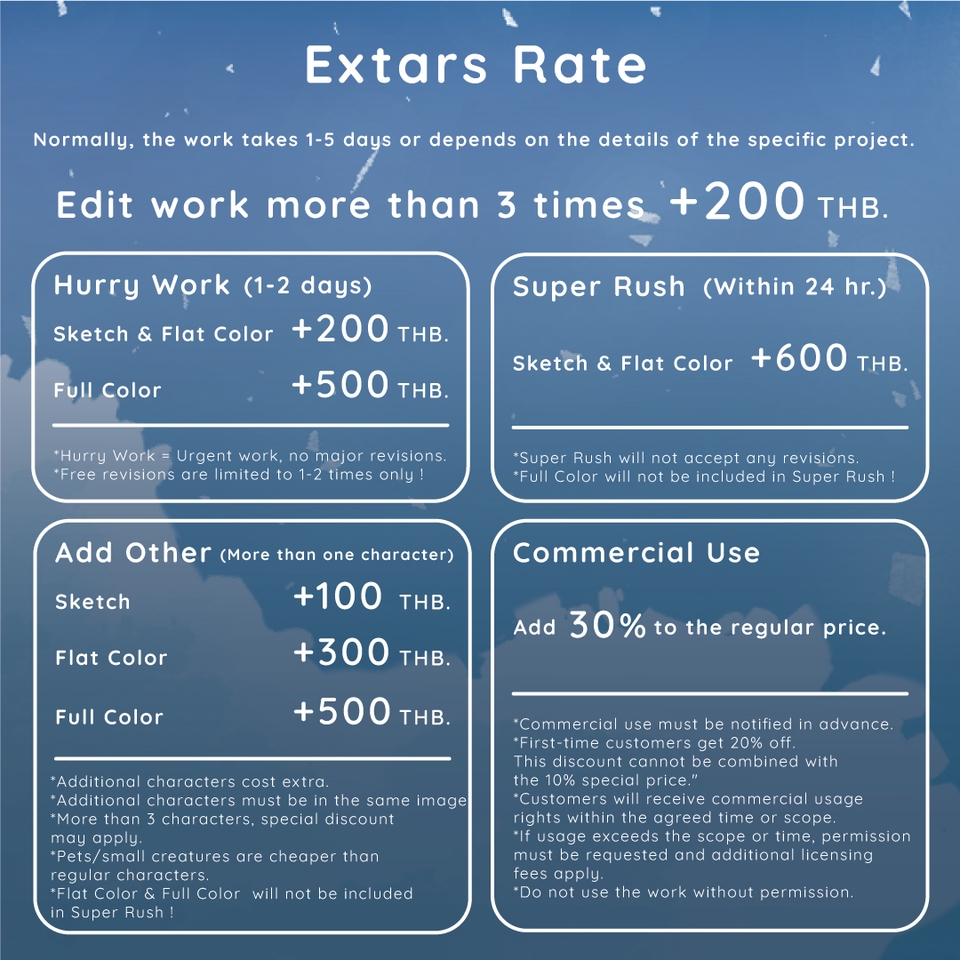 รับงาน Commission – วาดภาพสไตล์ Comic + Anime 🎨✨ เปิดรับคอมมิชชันวาดภาพตามสั่ง ด้วยลายเส้นเอกลักษณ์ที่โดดเด่นและอบอุ่น ราวกับภาพจากนิทานแฟนตาซี 💫 ไม่ว่าจะเป็น แฟนอาร์ต ภาพแนวฮีลใจสุดน่ารัก หรือภาพเซอร์ไพรส์สุดพิเศษสำหรับคนที่คุณรัก 📌 รองรับทั้งงานส่วนตัวและเชิงพาณิชย์ 📌 ปรับแต่งรายละเอียดตามความต้องการของลูกค้า 📌 ถ่ายทอดเรื่องราวผ่านลายเส้นที่มีเสน่ห์เฉพาะตัว รายละเอียดราคา มีดังต่อไป ⭐SKETCH (ร่างเส้น ) ✅Head Short (เฉพาะส่วนหัว) 100 บาท ✅Bust - Up (ส่วนหัว - อก) 190 บาท ✅Half - Body (ส่วนหัว-เอว) 290 บาท ✅Full - Body (เต็มตัว) 500 บาท ⭐FLAT COLOR (ลงเส้น แต่ลงสีพื้นแบน ) ✅Head Short (เฉพาะส่วนหัว) 290 บาท ✅Bust - Up (ส่วนหัว - อก) 350 บาท ✅Half - Body (ส่วนหัว-เอว) 500 บาท ✅Full - Body (เต็มตัว) 990 บาท ⭐FULL COLOR (ลงเส้นและสีให้สวยงาม ) ✅Head Short (เฉพาะส่วนหัว) 350 บาท ✅Bust - Up (ส่วนหัว - อก) 390 บาท ✅Half - Body (ส่วนหัว-เอว) 550 บาท ✅Full - Body (เต็มตัว) 1,090 บาท รายละเอียดราคาเพิ่มเติม *ปกติใช้ระยะเวลา 1-5 วัน หรือขึ้นกับรายละเอียดของงาน สามารถแก้งานได้ 3 ครั้ง ⭐เกินแก้งาน 3 ครั้ง คิดเพิ่ม 200 บาทต่อจุดที่แก้ หมายเหตุ งานนี้ไม่รับจิบิ SD ถ้าสนใจสอบถามหรือสั่งงาน ทักมาได้เลยค่ะ! 💌✨ ขั้นตอนการทำงาน 1. แจ้งรายละเอียดเกี่ยวกับแนวทาง ธีม หรือลักษณะของตัวละครที่คุณชื่นชอบ ตามที่ลูกค้าต้องการ หากมีงานอ้างอิง (Reference) ประกอบจะยิ่งดีมากค่ะ 2. ขอเสนอราคาและเงื่อนไขการทำงานเพื่อให้ตรงกับความต้องการของคุณลูกค้าได้ 3. เริ่มทำการร่างแบบให้เลือก 2 แบบ (ก่อนลงเส้น) โดยสามารถแก้ไขได้ 1 ครั้ง เพื่อให้ตรงกับความต้องการของคุณ 4. เริ่มทำงานจริงจัง และจะอัพเดทความคืบหน้าเป็นระยะ ๆ โดยสามารถแก้ไขได้ 3 ครั้ง หากเกินจำนวนที่กำหนด จะมีค่าใช้จ่ายเพิ่มเติม 200 บาทต่อการแก้ไขแต่ละครั้ง 5. เมื่อผลงานเสร็จเรียบร้อยแล้ว จะส่งรูปภาพติดลายน้ำให้ลูกค้าตรวจสอบก่อนการส่งมอบงานจริง 6. มื่อลูกค้าตอบตกลง ทางเราจะส่งมอบงานจริงในรูปแบบไฟล์ .png, .jpg หรือไฟล์ต้นฉบับตามที่ตกลงเอาไว้ค่ะ