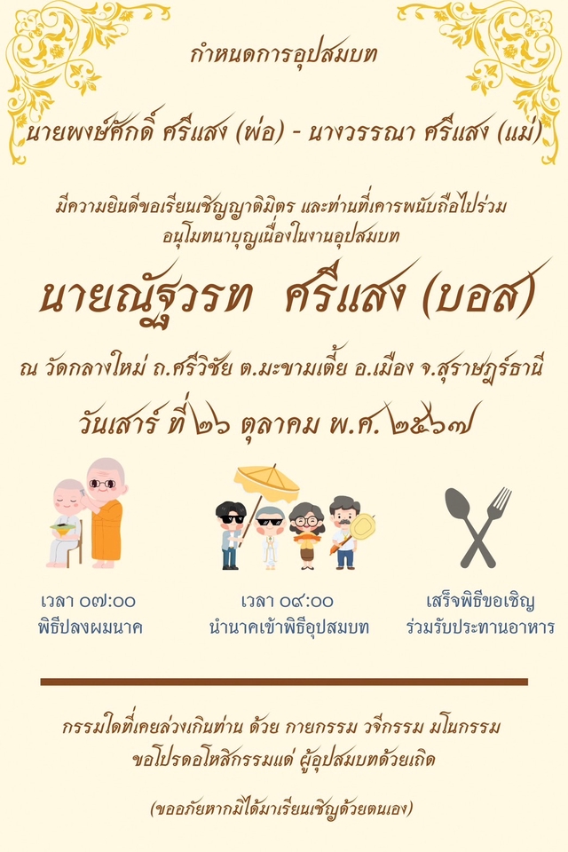 รับจ้างทำการ์ดงานบวช เพียงลูกค้าให้ชื่อพ่อนาค แม่นาค เจ้านาค มาแค่นี้เราสามารถอแกแบบอย่างที่ท่านต้องการได้เลยค่ะ หรืออยากได้อีโมจิอะไร request มาได้เลยค่ะ ราคาไม่แรง เป็นกันเอง เพราะว่าพึ่งเริ่มออกแบบอยากเป็นส่วนนึงของเพื่อนๆค่ะ ขั้นตอนการทำงาน 1. แจ้งรายละเอียดของงาน ขนาด ชื่อผู้เกี่ยวข้อง สิ่งที่อยาก Request 2. ใช้เวลาการทำประมาณ 3-5 วันทำการ 3. ส่งแบบให้ตรวจสอบ+แก้ไขได้ไม่จำกัดจำนวนครั้ง 4. ส่งแบบไฟนอล+พร้อมไฟล์รูปภาพ