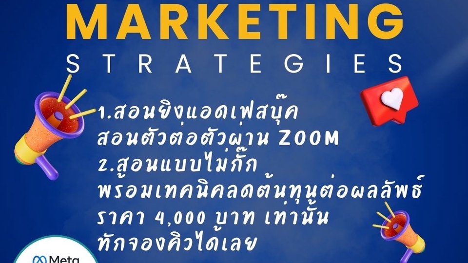 ฿4,0001.สอนผ่าน zoom โดยการที่ลูกค้าแชร์หน้าจอ และตั้งค่าแอดเฟสบุคตาม best practice facebook การคุยกัน 1 ชั่วโมง 2.อธิบาย mindset การยิงแอด และลดต้นทนต่อผลลัพธ์ 3.ลูกค้าสามารถ set ads facebook เองได้ โดยไม่จำเป็นต้องจ้างใคร จะได้ไม่โดนโกง 4.คนไม่มีประสบการณ์ สามารถเริ่มได้เลยทันที 5.follow up งาน 1 ครั้ง / ดูวิเคราะห์ผล อ่านผล /วางแผนถัดไป