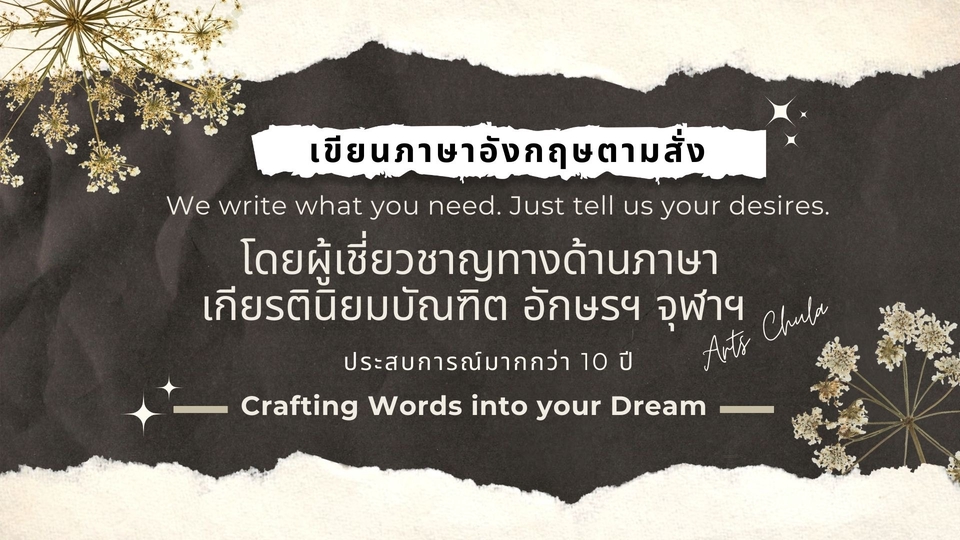 • ผู้เชี่ยวชาญทางด้านภาษา เกียรตินิยมบัณฑิต อักษรฯ จุฬาฯ • อดีตนักเรียนทุนแลกเปลี่ยน Germany และ USA • มีประสบการณ์การทำงานให้กับองค์การสหประชาชาติ (UN) ในหลายหน่วยงานมานานกว่า 10 ปี • เป็นอาจารย์และเจ้าของสถาบันสอนภาษาอังกฤษ • Proof reading โดยเจ้าของภาษา พร้อมด้วยทีมงานคุณภาพ