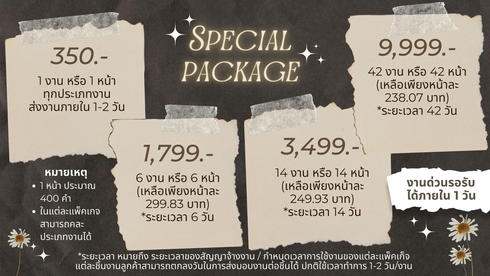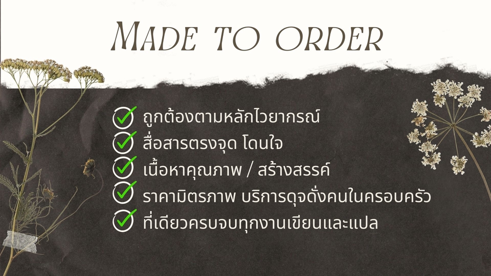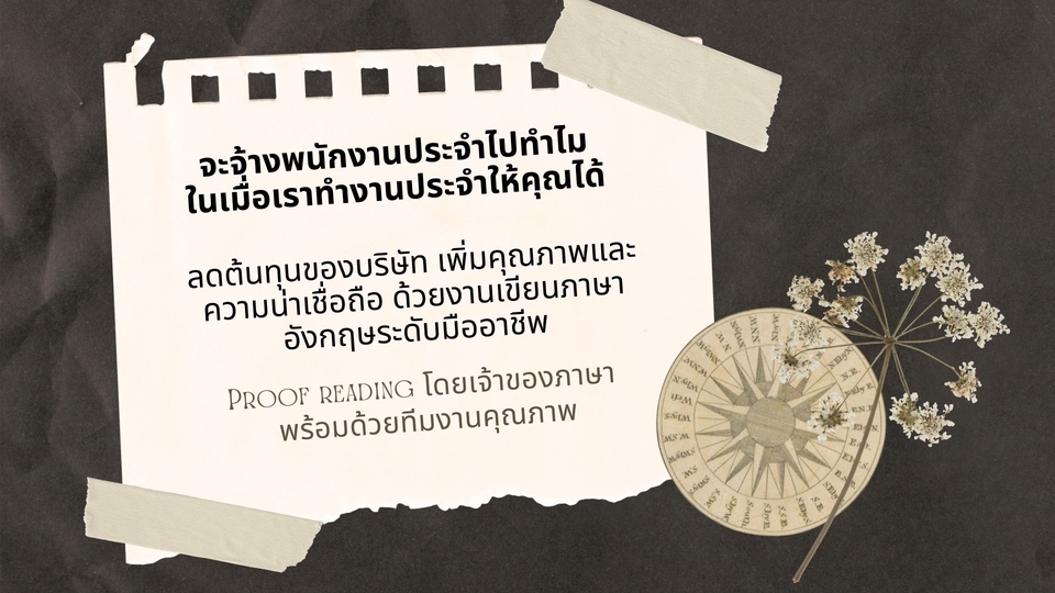 • ผู้เชี่ยวชาญทางด้านภาษา เกียรตินิยมบัณฑิต อักษรฯ จุฬาฯ • อดีตนักเรียนทุนแลกเปลี่ยนประเทศเยอรมนีและประเทศสหรัฐอเมริกา • มีประสบการณ์การใช้ภาษาอังกฤษมากว่า 20 ปี • มีประสบการณ์การทำงานให้กับองค์การสหประชาชาติ (UN) ในหลายหน่วยงานมากว่า 10 ปี • เป็นอาจารย์และเจ้าของสถาบันสอนภาษาอังกฤษและการแปล • Proof reading โดยเจ้าของภาษา พร้อมด้วยทีมงานคุณภาพ • เป็นที่ปรึกษาพิเศษฝ่ายความสัมพันธ์ระหว่างประเทศให้กับบริษัทนำเข้า-ส่งออกระดับประเทศ ขั้นตอนการทำงาน 1. สอบถามความต้องการของลูกค้า 2. แจ้งใบเสนอราคาและระยะเวลาในการทำงาน 3. ทำงานส่งเรียบร้อยตามกำหนดการ