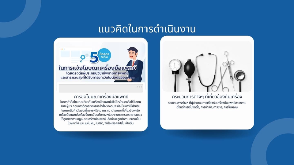 รับขึ้นทะเบียนเครื่องมือแพทย์ทุกประเภท กับทาง อย. ในกลุ่มเครื่องมือแพทย์ ผู้ดำเนินการมีประสบการณ์ในสายงาน Regulatory Affairs & Quality Assurance ทางด้านเครื่องมือแพทย์เป็นระยะเวลา 6 ปี ทั้งในและต่างประเทศ เช่น Cambodia, Myanmar และมีความชำนาญในเรื่องของการขึ้นทะเบียนในรูปแบบ CSDT เป็นพิเศษ