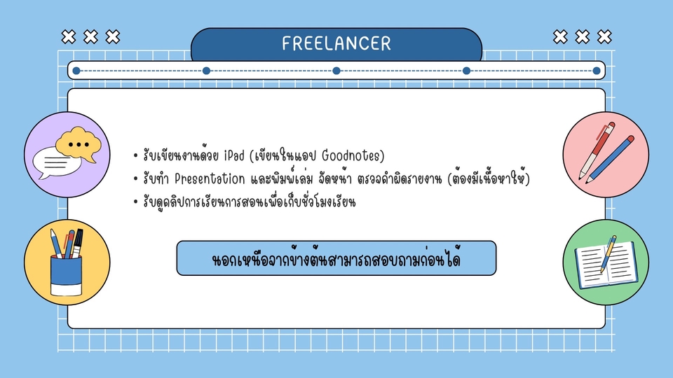 รับพิมพ์งาน เขียนงาน ดูสื่อการสอนเพื่อเก็บชั่วโมงเรียน มีเวลาทำให้ทั้งวัน ทุกวัน อยากได้งานภายในกี่วันแจ้งได้