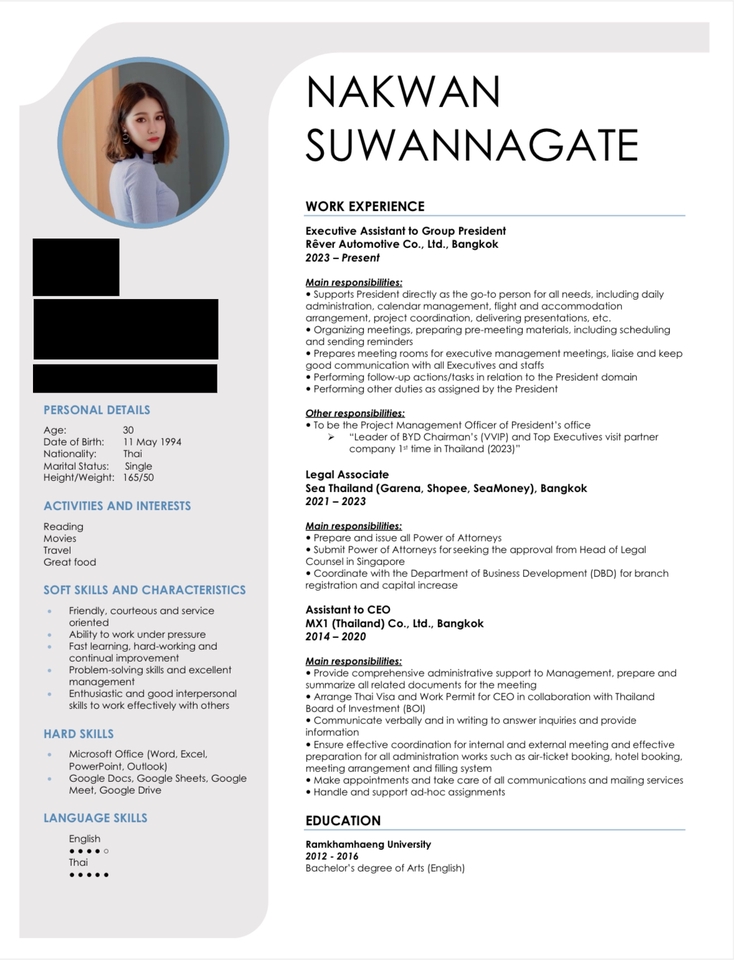 ประสบการณ์ด้านเลขานุการและผู้ช่วยส่วนตัวมากกว่า 8 ปี เคยเป็นเลขานุการผู้บริหารระดับสูงของบริษัทรถยนต์ชั้นนำ มีความละเอียดรอบคอบ คล่องตัวสูง สามารถจัดการและแก้ไขปัญหาได้ดีและรวดเร็ว มนุษยสัมพันธ์และอัธยาศัยดี