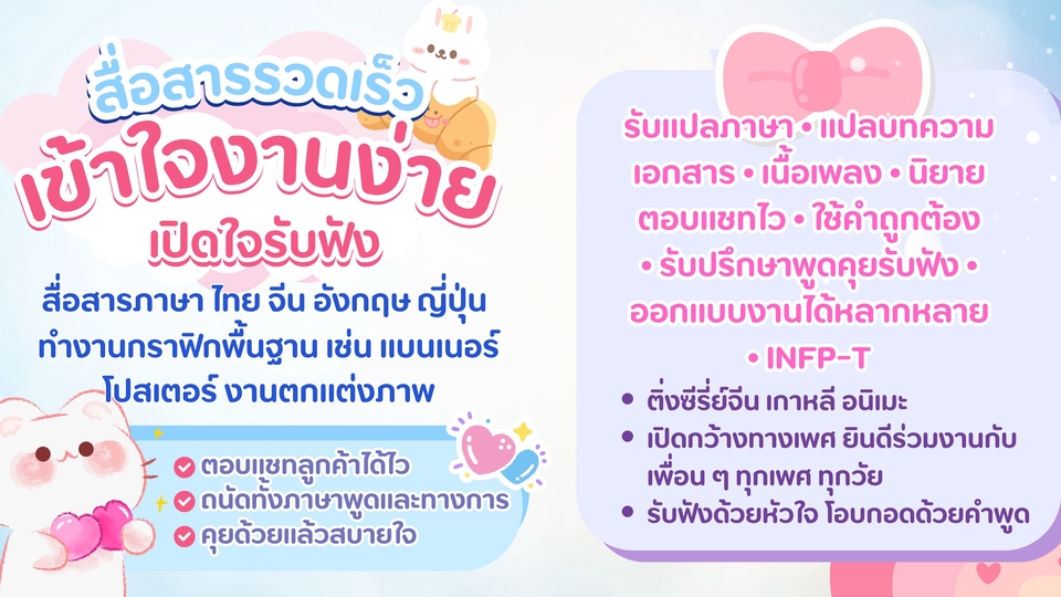 พื้นฐานด้านมนุษยศาสตร์ เอกภาษาจีน ใช้ภาษาไทย จีน อังกฤษ ญี่ปุ่นจากประสบการณ์จริง เคยทำงานแปล ล่าม และตอบแชทจำนวนมาก รวมถึงงานกราฟิกเบื้องต้น เป็นคนเงียบ สุภาพ รับฟังได้ดี เข้าใจภาวะทางใจจากประสบการณ์ตรงในฐานะผู้ป่วยสุขภาพจิต พร้อมอยู่ข้าง ๆ อย่างไม่ตัดสิน MBTI - INFP-T