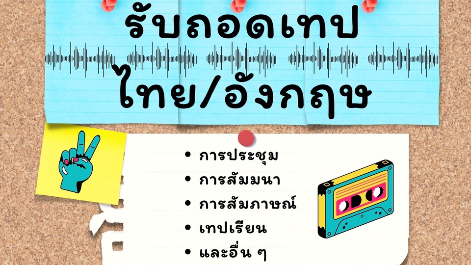 รับถอดเทปเสียงทุกรูปแบบ (ภาษาไทย/ภาษาอังกฤษ) 📼❗️*พร้อมจัดหน้า 📶 คิดราคาตามนาที ภาษาไทยนาทีละ 25 / ภาษาอังกฤษนาทีละ 40) 📶 ราคาประมาณคร่าว ๆ สามารถพูดคุยกันก่อนได้ 📶 แก้ไขฟรี (กรณีสะกดผิด) 📶 งานเร่งชาร์จเพิ่ม 20% *มีประสบการณ์ด้านการถอดเทปเสียงสัมมนา และการประชุมกลุ่ม ขั้นตอนการดำเนินการ 📼❗️ ⭐️ ลูกค้าส่งไฟล์เสียง พร้อมแจ้งวันเวลาที่ต้องการรับงาน และรายละเอียดอื่น ๆ เพิ่มเติม ⭐️ ประเมินราคา คุณภาพเสียงและระยะเวลาในการถอดเทป ⭐️ ลูกค้ายืนยันวันส่งงานและราคา พร้อมชำระเงิน ⭐️ สามารถแจ้งแก้ไขได้ หากมีข้อผิดพลาด ⭐️ เมื่อแก้ไขแล้ว จึงจะส่งอีกครั้ง ขั้นตอนการทำงาน 1. ลูกค้าส่งไฟล์เสียง แจ้งวันเวลาที่ต้องการรับงาน+บรีฟต่าง ๆ 2. ทางเราจะประเมินคุณภาพเสียง วันเวลาที่จะสามารถส่งให้เร็วที่สุด เพื่อประเมินราคา 3. ลูกค้ายืนยัน วันเวลาส่งงานเรทราคาที่ตกลง และชำระค่าจ้าง 4. ส่งงานให้ 5. สามารถแก้ไขได้ฟรีในกรณีที่สะกดผิด หรือตกหล่นใด ๆ 6. แก้ไขและส่งงานให้อีกครั้ง