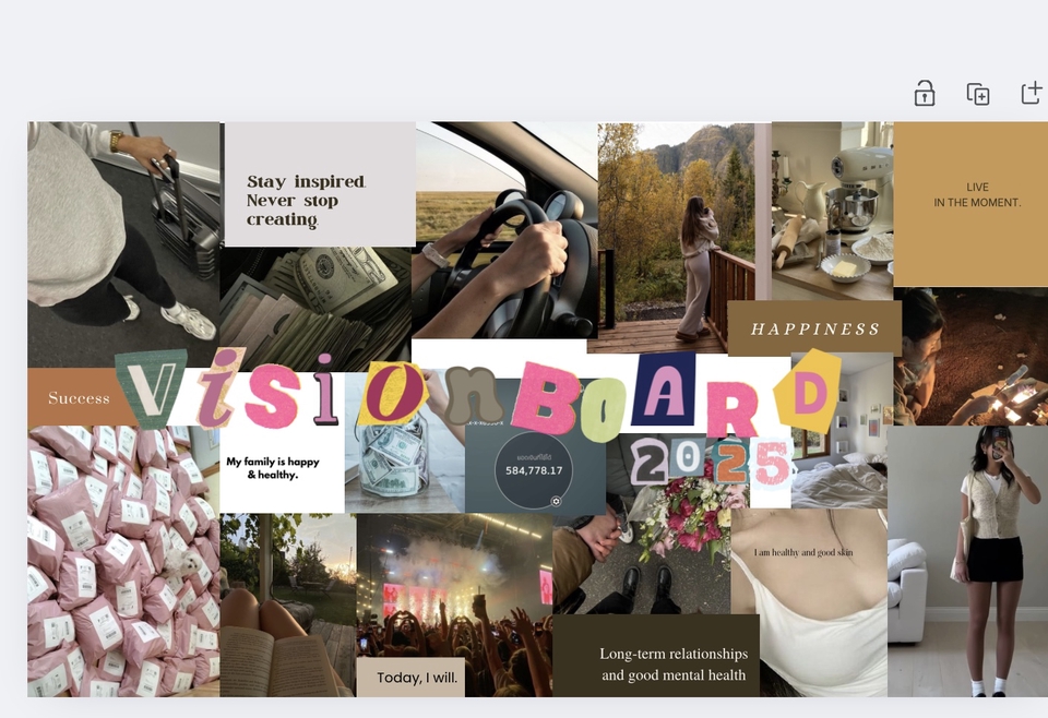 รับทำออกแบบ vision board ผ่าน canva ใส่รูปตามความต้องการ ตั้งเป้าหมาย📍จุดประสงค์ ตามความต้องการ vision board manifestation รูปจากพินเทอเรส ใ่ส่ข้อความ positive 💖 ขั้นตอนการทำงาน 1. ส่งความต้องการหรือรูปที่ชอบมาและ สามารถเน้นได้ว่าจะให้รูปไหนเป็นหลัก 2. จะส่งตัวอย่างกลับไป2-3แบบ