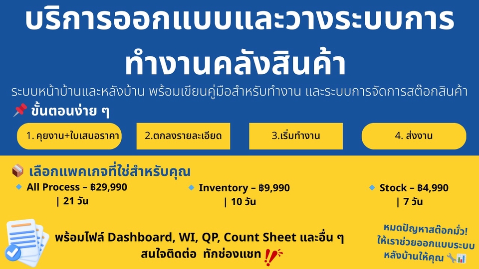 บริการให้คำปรึกษา ออกแบบ และวางระบบการทำงานคลังสินค้า ทั้งระบบหน้าบ้านและหลังบ้าน เขียนขั้นตอนการทำงาน Process Flow Diagram, Quality Procedure(QP) และ Work Instruction (WI) สำหรับเป็นคู่มือในการทำงาน และระบบการจัดการสต๊อกหรือสินค้าคงคลัง (Inventory) ขั้นตอนการทำงาน 1. สรุปตกลงราคาและเงื่อนไข (สามารถเลือกตามแพคเกจและ rate card 2. ลูกค้าส่งรายละเอียด 3. ดำเนินงาน (ขึ้นอยู่กับการตกลง) 4. ส่งงาน ขั้นตอนการทำงาน 1. คุยงาน + ส่งใบเสนอราคา 2. ตกลงรายละเอียดการทำงาน 3. เริ่มทำงาน 4. ส่งงาน