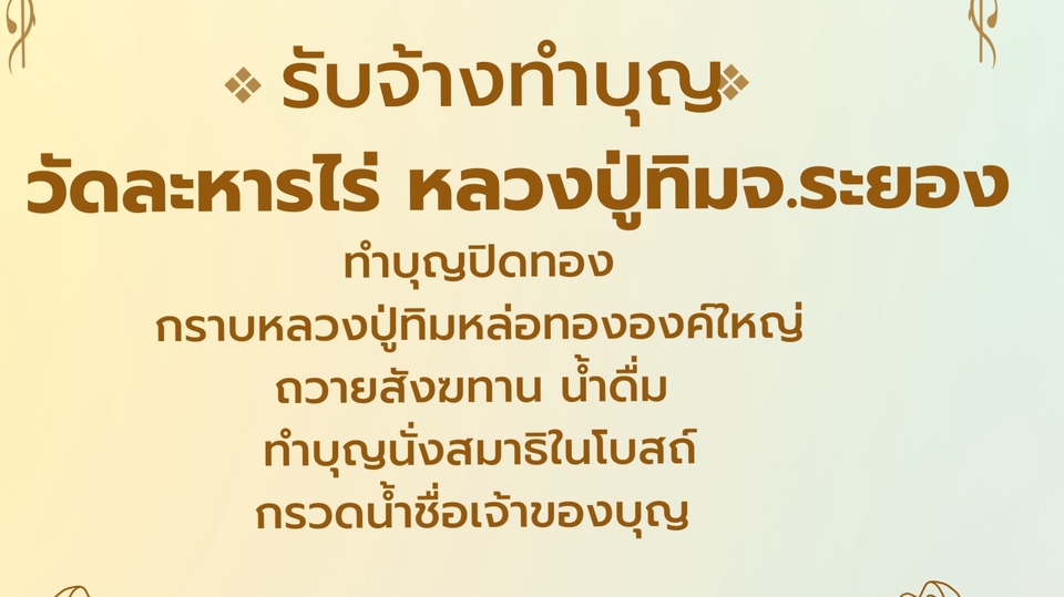 สำหรับคนที่ไม่มีเวลา และเพื่อความสบายใจที่ได้ทำบุญ ข้าพเจ้าจึงรับจ้างทำบุญแทน โดยเขียนชื่อเจ้าของงาน และกรวดน้ำในนามเจ้าของงาน ที่วัดละหารไร่วัดหลวงปู่ทิมจังหวัดระยอง เกจิชื่อดังระดับประเทศ เป็นวัดที่ใหญ่ มีองค์หล่อหลวงปู่ทิมขนาดใหญ่มาก ที่ตั้งอยู่ในวัดต้องเดินขึ้นบันไดไปกราบ มีทำบุญปิดทองพระ ถวายสังฆทาน และทำบุญใหโบสถ์ ขั้นตอนการทำงาน 1. ทำบุญ 2. ส่งรูปทำบุญต่างๆตามคำขอ