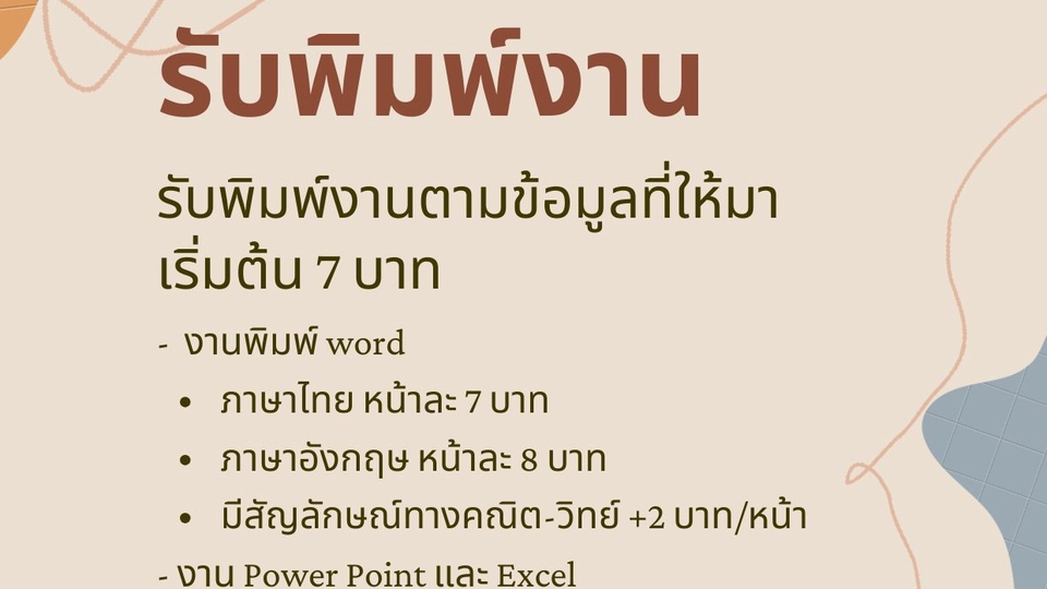 มีประสบการณ์ด้านการพิมพ์งานเอกสารและคีย์ข้อมูลมาก่อน พิมพ์รายงาน พิมพ์ข้อสอบ ออกแบบสไลด์ ทำสไลด์โชว์ผลงาน จัดหน้าเอกสาร จัดทำหนังสืออีบุ๊ค สามารถใช้ Microsoft office ได้ดี งานพิมพ์เอกสาร word - ภาษาไทย หน้าละ 7 บาท - ภาษาอังกฤษ หน้าละ 8 บาท * ถ้ามีสัญลักษณ์หรืออักขระทางคณิตศาสตร์วิทยาศาสตร์ +2 งานออกแบบสไลด์ (ลูกค้าต้องมีข้อมูลมาให้) PPT - หน้าละ 10 บาท งานคีย์ข้อมูลลง Excel - หน้าละ 10 บาท จัดหน้าเอกสาร ใส่เลขหน้า - หน้าละ 2-3 บาท สนใจทักมาสอบถามก่อนนะ ขั้นตอนการทำงาน 1. รับงาน พูดคุยและตกลงรายละเอียดกับลูกค้า 2. เริ่มทำงาน 3. ส่งงานให้ลูกค้าเช็คความเรียบร้อย 4. ถ้ามีข้อผิดพลาดสามารถแจ้งแก้ไขได้ไม่เกินสามครั้ง