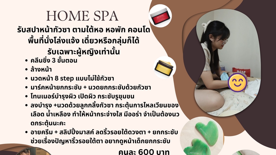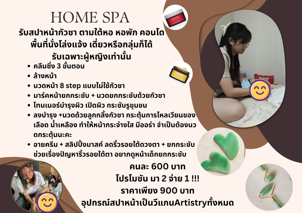 • คลีนซิ่ง 3 ขั้นตอน • ล้างหน้า • นวดหน้า 8 Step (แบบไม่ใช้กัวซา) • มาคหน้ายกกระชับ + นวดยกกระชับด้วยกัวซา • โทนเนอร์บำรุงผิว เปิดผิว กระชับรูขุมขน • ลงบำรุง + นวดด้วยลูกกลิ้งกัวซา กระตุ้นการไหลเวียนของเลือด น้ำเหลือง (เหมาะกับคนอยากหน้ากระจ่างใส มีออร่า จำเป็นต้องนวดกระตุ้นนะคะ✨) • Eye cream ลดริ้วรอยใต้ดวงตา + ยกกระชับ (เหมาะมาก กับคนที่กังวัล/มีปัญหาเรืองริ้วรอยใต้ตา อยากดูหน้าเด็ก ยกกระชับ) ปล.ใช้สกินแคร์ Artistry ทุกชิ้น💕 สิ่งที่ได้รับหลังสปาหน้า - หน้ากระจ่างใสขึ้น - ใบหน้าชุ่มชื้น - ร่องลึกที่แก้มดูตื้นขึ้น - เช้ามาแต่งหน้าติด - หอมสดชื่นระหว่างทำสปา - บางคนอาจใบหน้ายกกระชับ แก้มยก - ความผ่อนคลายจากการนวดใบหน้า ขั้นตอนการทำงาน 1. คลีนซิ่งหน้า 2. นวดหน้า8สเตป 3. มาร์คหน้ายกกระชับ 4. นวดยกกระชับด้วยกัวซา 5. ลงบำรุง