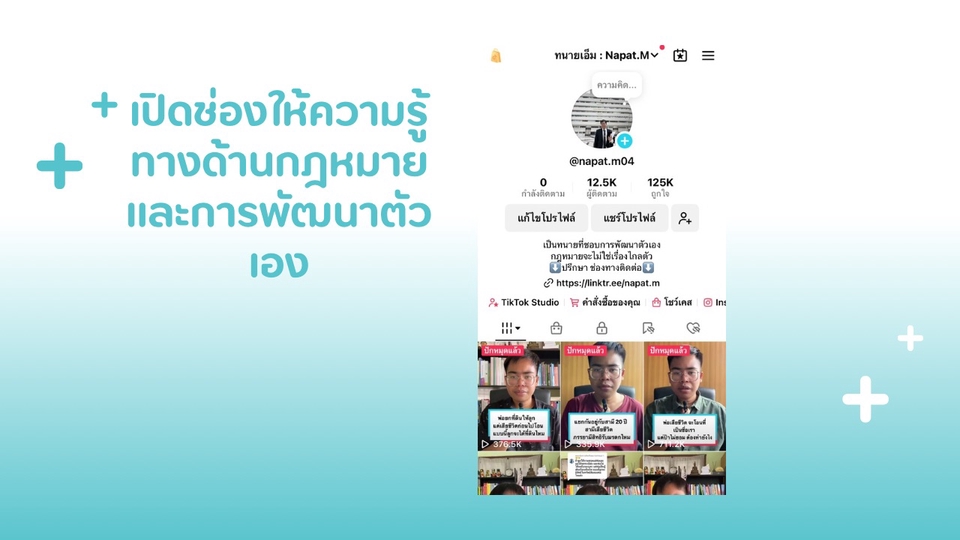 ปริญญาตรีนิติศาสตรบัณฑิต, ใบอนุญาตว่าความ, ประสบการณ์การป็นทนายความ content creator เปิดช่องให้ความรู้ทางกฎหมายและการพัฒนาตัวเอง,ประกิบธุรกิจ -มีความสนใจและคลั่งไคล้ในเรื่องของการพัฒนาตัวเอง และได้ใช้ความรู้ของการพัฒนาตัวเอง ผลักดันชีวิตในเรื่องการงานการเงิน ความสัมพันธ์ สุขภาพ จนก้าวหน้า -สามารถใช้ความรู้ให้คำปรึกษาในเรื่องกฎหมาย การพัฒนาตัวเอง และความสัมพันธ์ เพื่อต้องการให้ชีวิตคนอื่นดีขึ้น