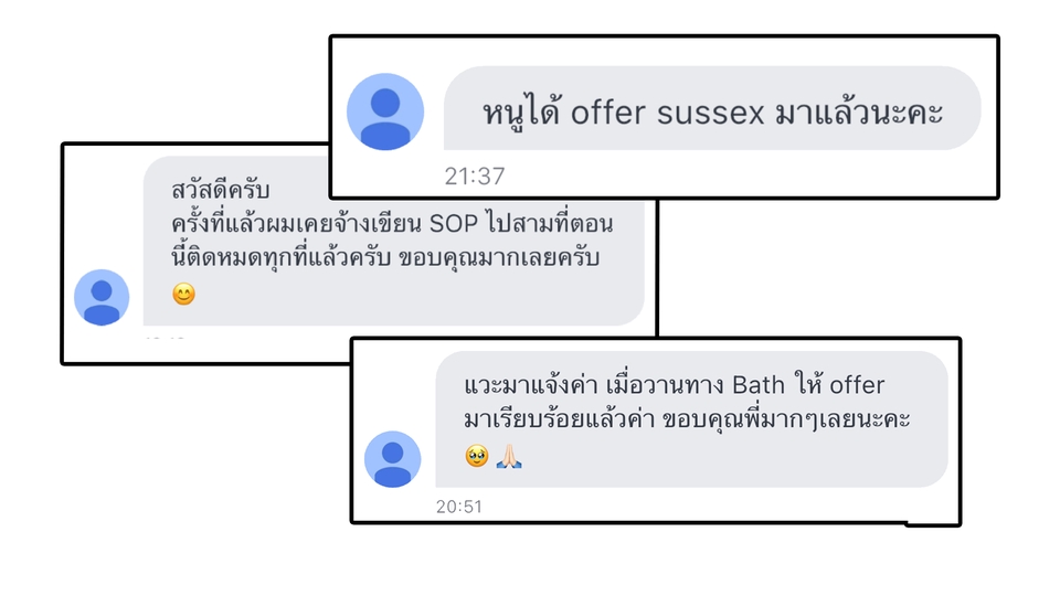 ✦การันตีคุณภาพงานโดย นักเรียนทุนรัฐบาลและปริญญาโทกฎหมายจาก Boston University, USA✦ บริการร่าง Statement of Purpose (SOP) และ Letter of Reccomendation (LOR) สำหรับสมัครเรียนต่อต่างประเทศ ทั้งระดับปริญญาตรี (Undergraduate) หรือปริญญาโท (Graduate) รวมถึงคำขอทุนการศึกษาจากมหาวิทยาลัย (Scholarship Essay) ✦นักเรียนทุนรัฐบาล✦ ✦ปริญญาโทด้านกฎหมายการธนาคารและการเงินจากมหาวิทยาลัยบอสตัน (ท๊อป 1 ใน 10 อันดับมหาวิทยาลัยกฎหมายการธนาคารและการเงินจาก LLM Guide 2023)✦ ✦ประกาศนียบัตรด้านภาษาอังกฤษสำหรับกฎหมาย✦ ขั้นตอนการทำงาน 1. ลูกค้าแจ้งรายละเอียดและข้อกำหนดของ SOP เบื้องต้น (หากมี) เช่น Font และขนาดตัวอักษร จำนวนคำ 2. ลูกค้าร่างประวัติเบื้องต้นให้ Freelance ทราบ หรือนัดสัมภาษณ์ประวัติกับ Freelance เพื่อนำข้อมูลมาประกอบการร่าง SOP 3. Freelance ร่าง SOP ตามข้อมูลที่ได้รับจากลูกค้าและเสนอลูกค้าพิจารณา 4. ลูกค้าสามารถอนุมัติงานได้หากไม่มีข้อแก้ไขหรือปรับปรุงเพิ่มเติม